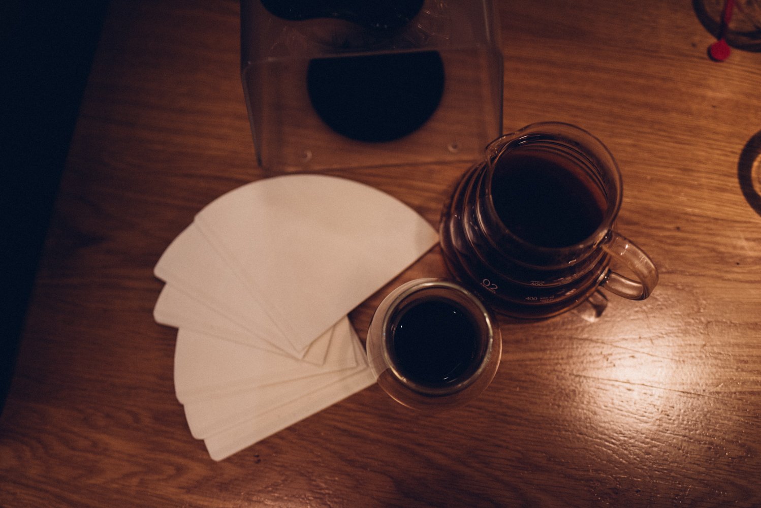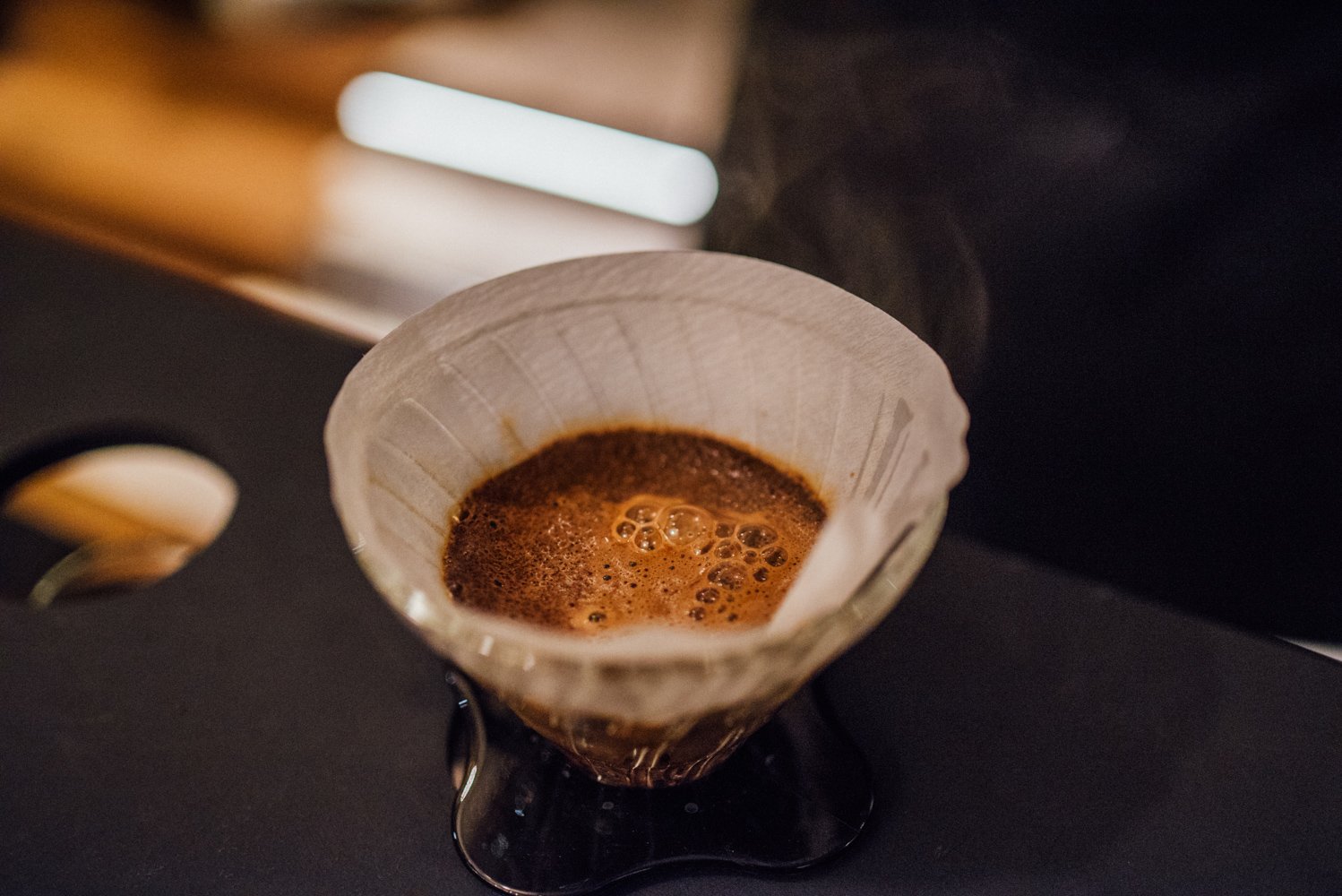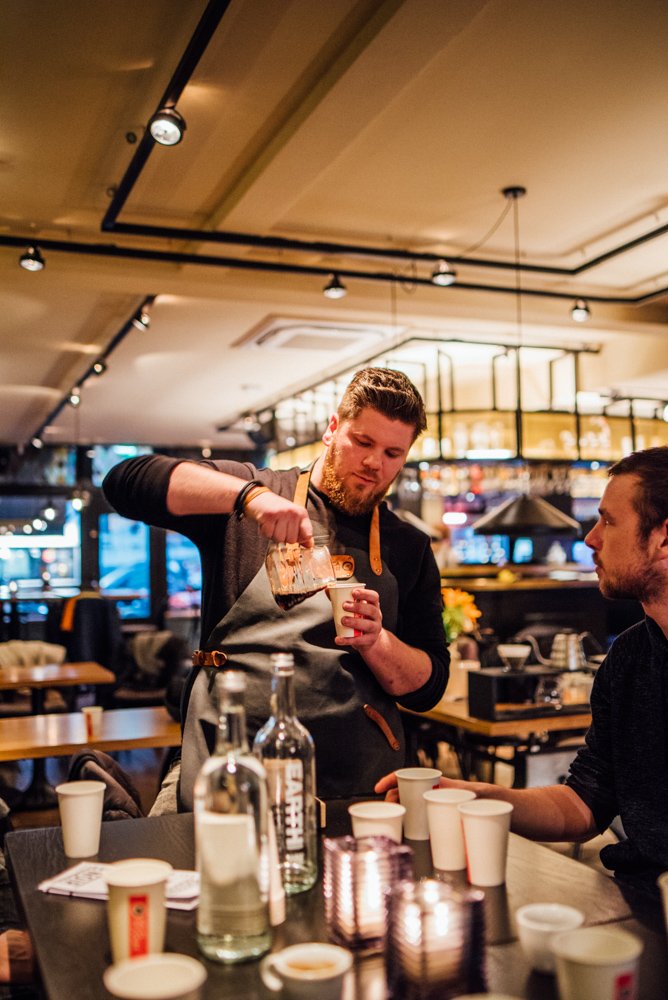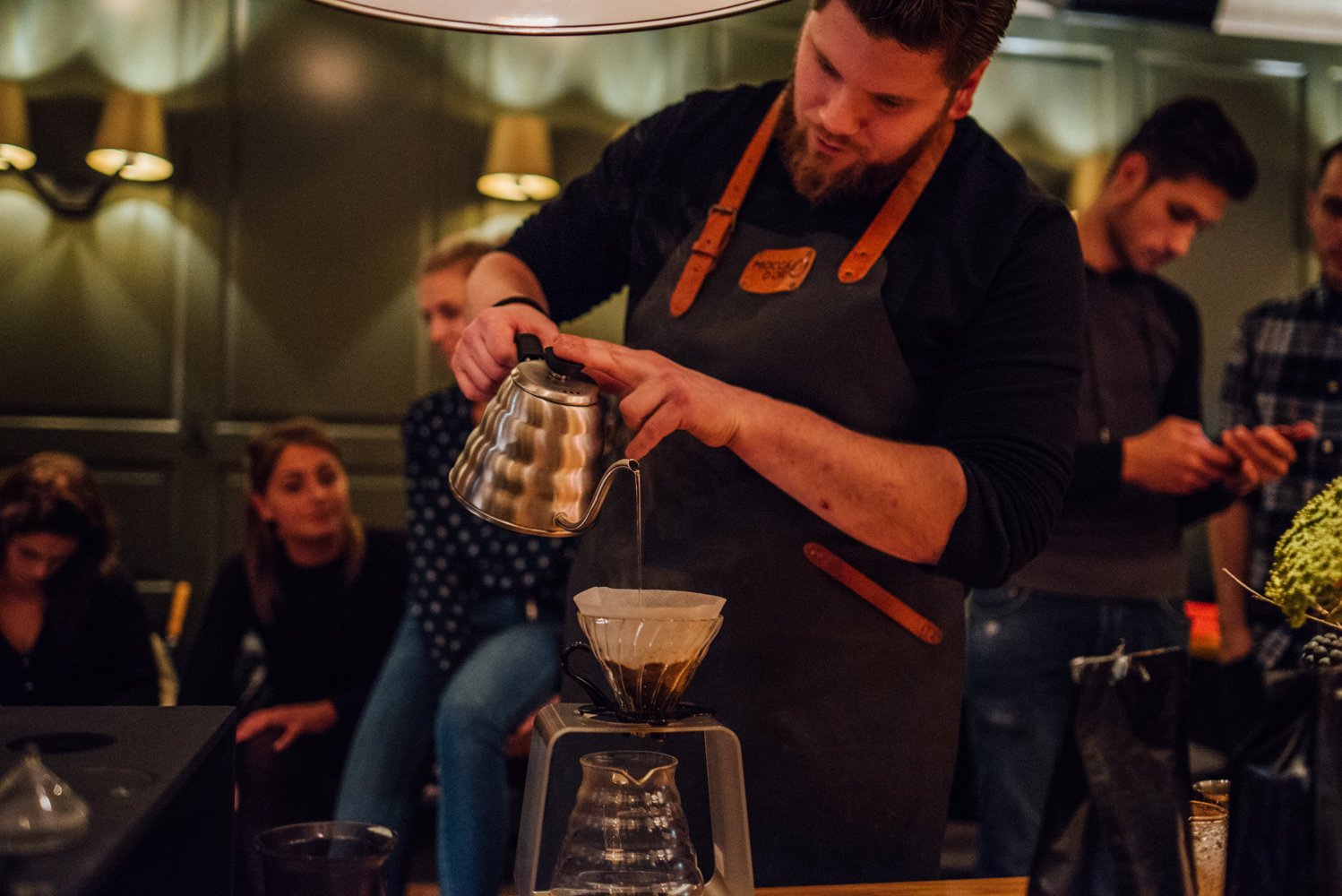 Joël laat ons tijdens de masterclass zien hoe hij het water in cirkels en met beleid de filter in giet (in maximaal drie minuten, anders wordt de koffie bitter). Hierdoor komt het water met alle korrels in aanraking. De koffie die het eerst door de filter loopt is sterker dan het laatste beetje. Roer daarom de koffie even door, voordat je deze uitschenkt.
