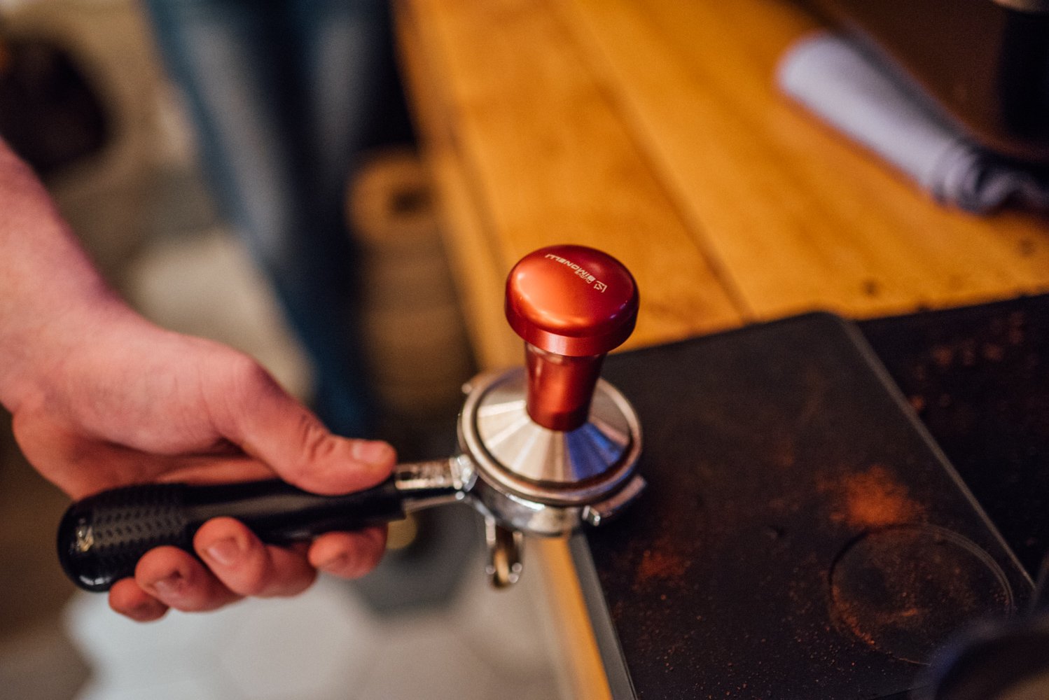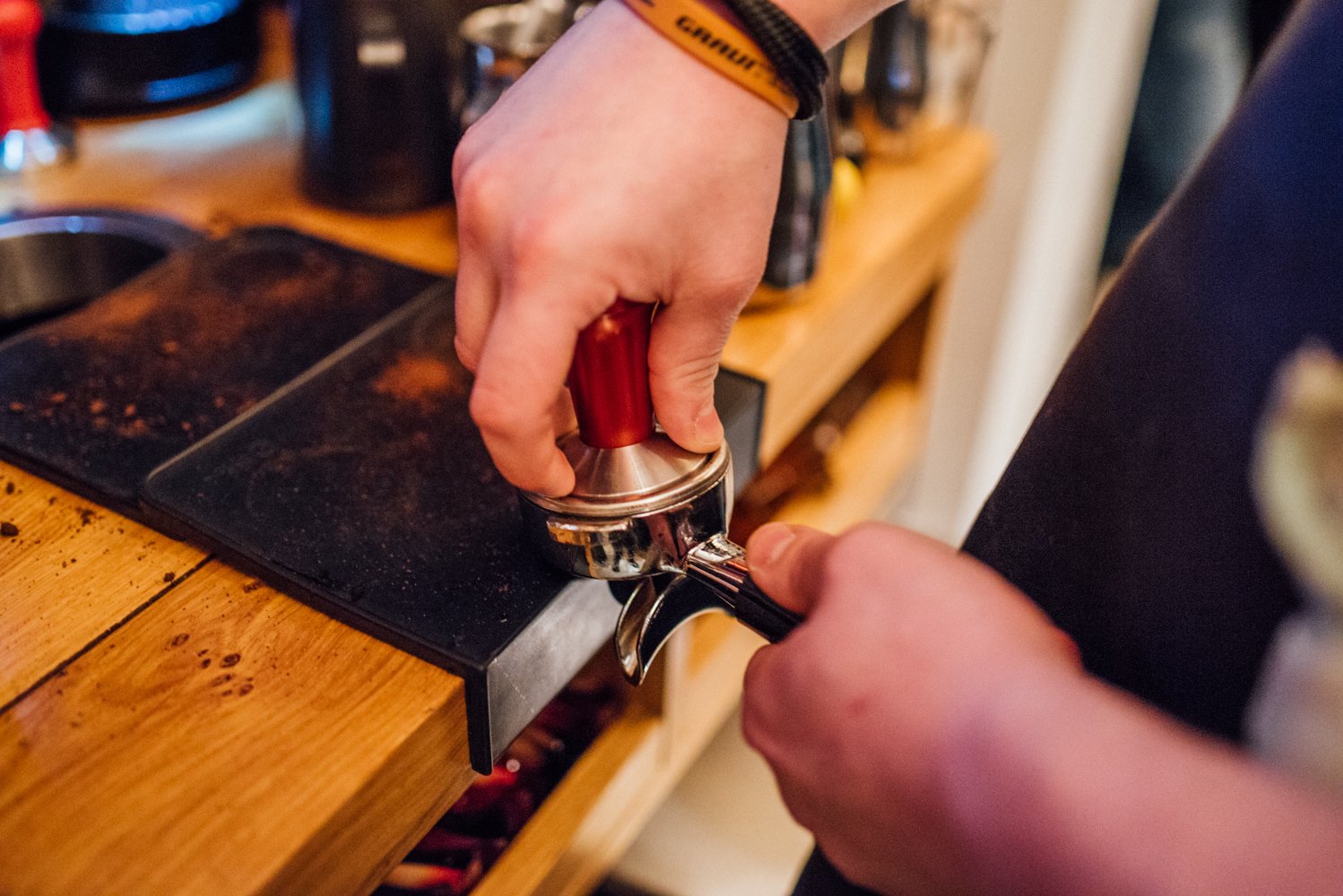 Na het malen van de bonen, vertelt barista Joël ons dat het belangrijk is om de papieren koffiefilter even met warmwater nat te maken, voordat je de koffie gaat zetten.
