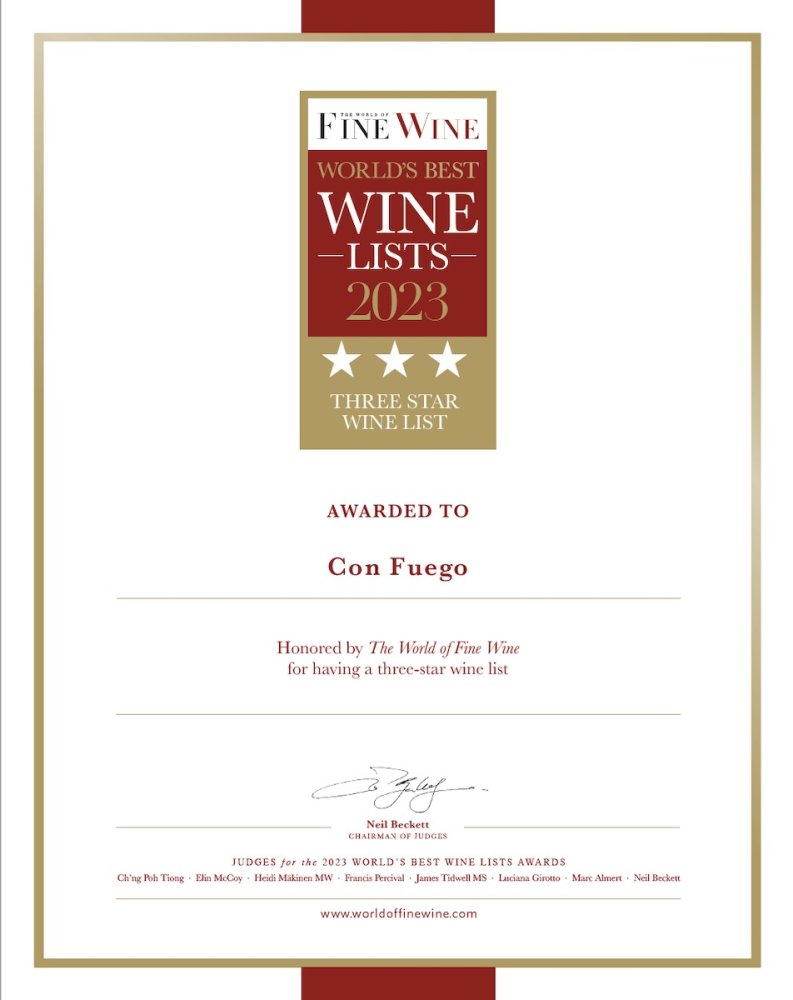 Con Fuego heeft voor zijn wijnkaart 3 uit 3 sterren gekregen van het gerenommeerde wijnmagazine The World of Fine Wine. Over de gehele wereld zijn er maar 158 restaurants die 3 sterren hebben ontvangen.