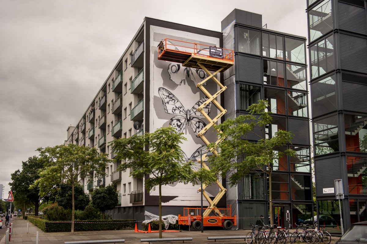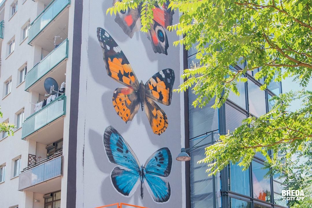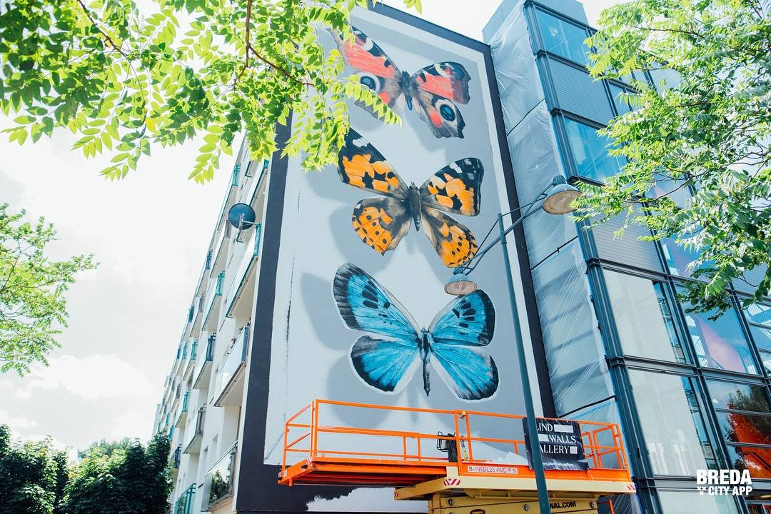 Het is twintig meter hoog en er staan grote gekleurde vlinders op... Deze week wordt de hoogste muurschildering van de Bredase Blind Walls Gallery gemaakt op een flat aan de Tuinzigtlaan. De Franse kunstenaar Mantra legt komende dagen de laatste hand aan dit vrolijke stuk kunst dat onderdeel uitmaakt van de verzameling murals in Breda.