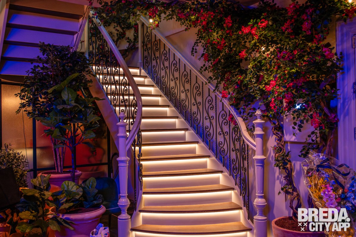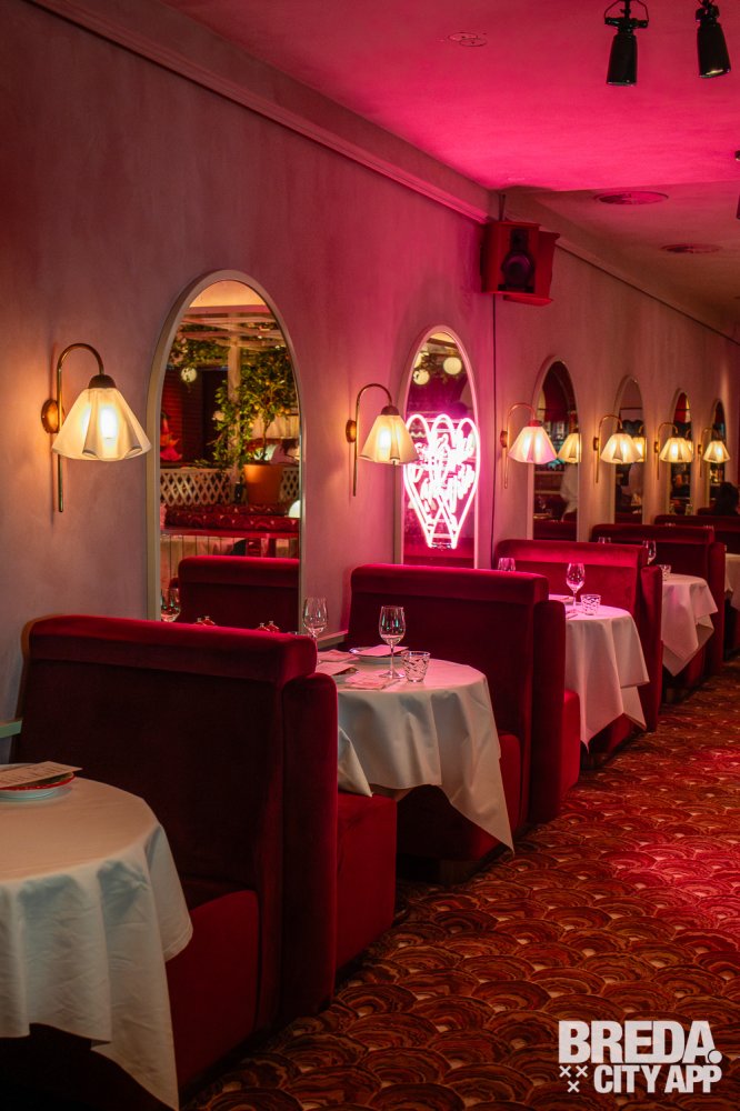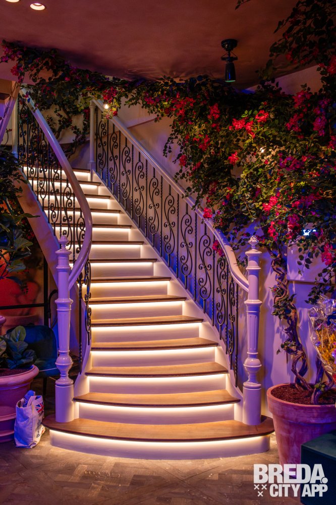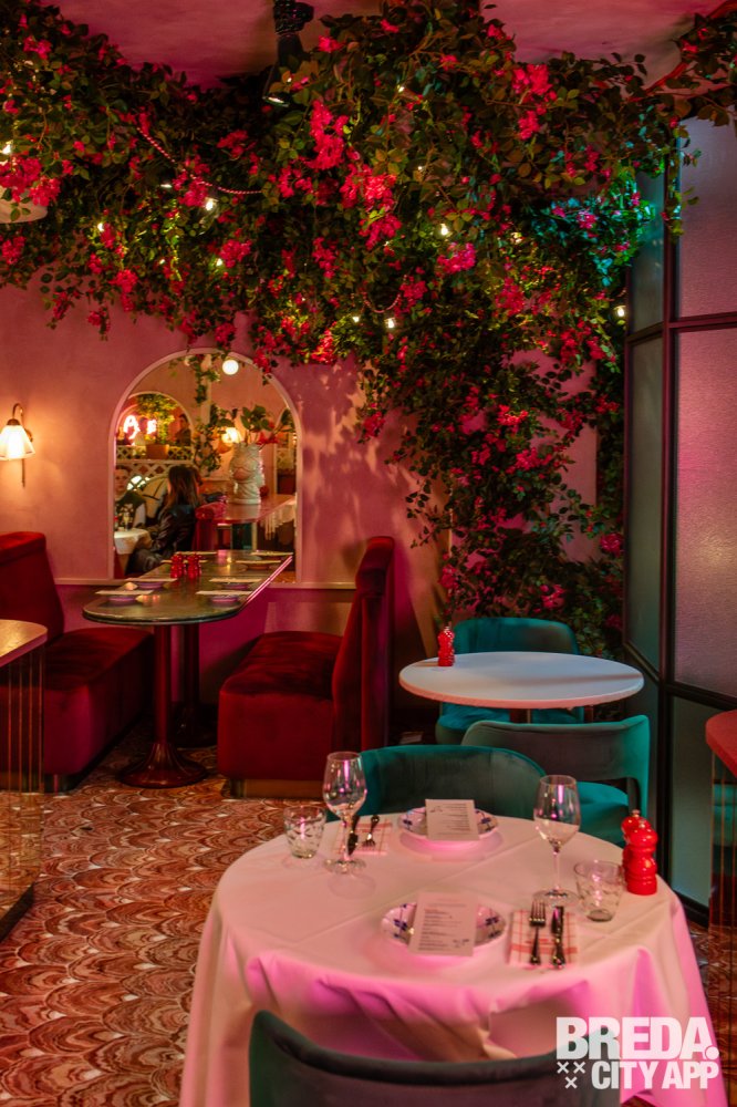 Wij krijgen een plekje op de eerst etage met uitzicht op de Grote Markt. Via de prachtig verlichte trap begeven we ons naar een nieuwe belevingswereld. De stijl van het interieur is hier heel anders met veel rood, spiegels, gave neon verlichting en veel groen met bloemen die over het plafond hangen. Dit is een zaak waar je gewoon foto’s moet maken!