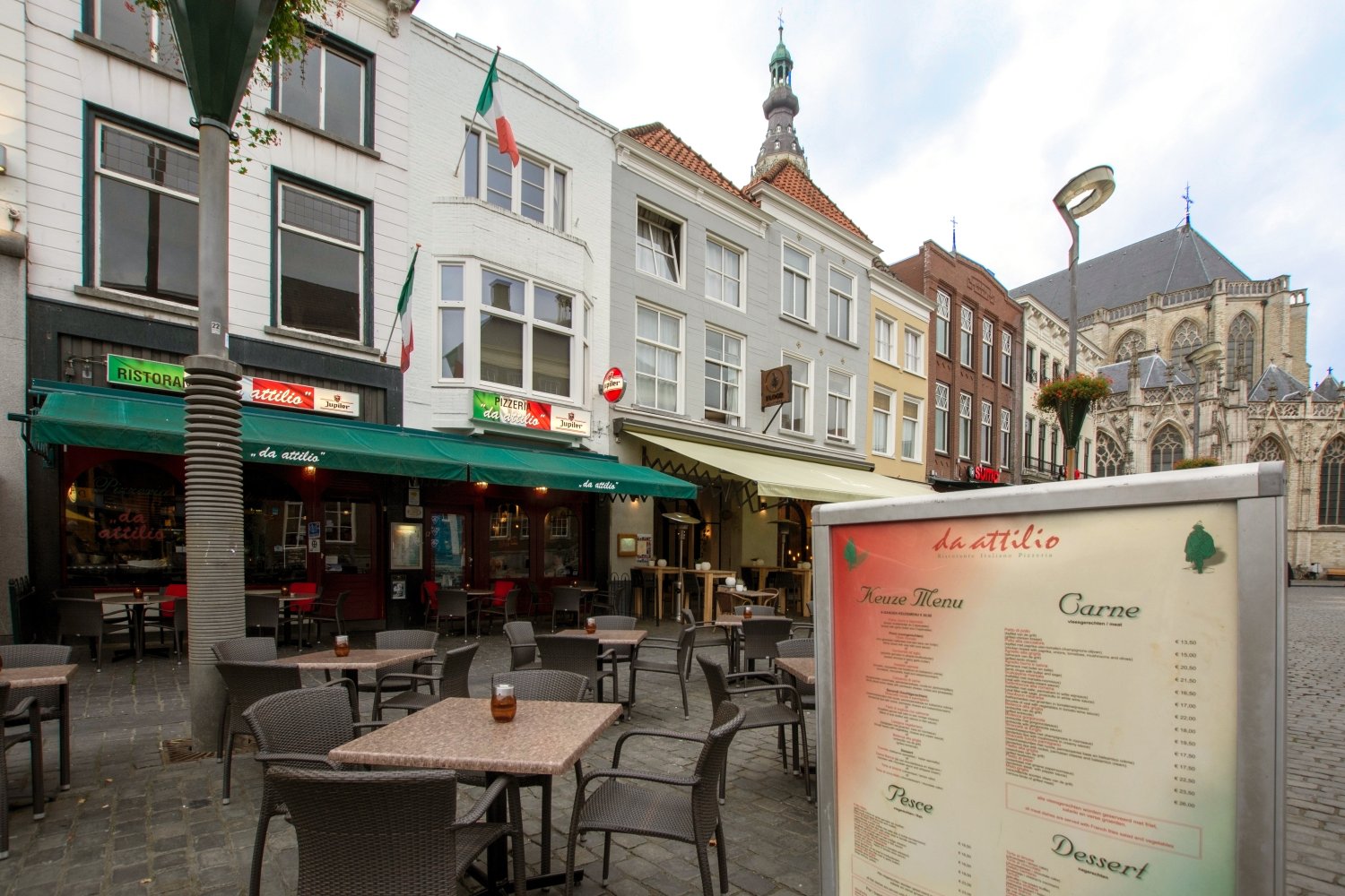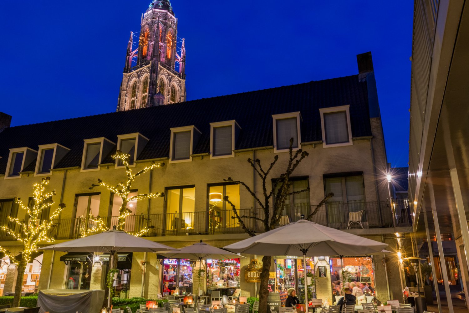 Aan de andere kant van de grote markt geniet je bij Café Vulling, Con Fuego, Da Attilio, Parc Breda, Dickens & Jones, Rodeo en De Colonie met het prachtigste uitzicht op de Grote Kerk!