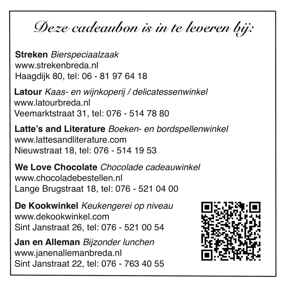 Zes lokale ondernemers uit de binnenstad van Breda hebben de handen ineengeslagen om een cadeaubon uit te brengen die bij meerdere prachtige winkels uit te geven (en te koop) is. Je kunt bijvoorbeeld bij Latte's and Literature een bordspel voor het hele gezin kopen of een boek om urenlang in weg te dromen. Lekker met je boek op de bank, met een heerlijke koffie of thee en natuurlijk chocolade van We Love Chocolate!