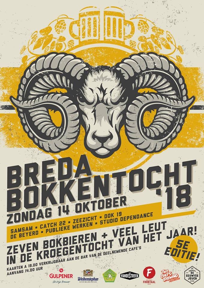 Dit jaar is al weer de 5de kroegentocht van het jaar! 7 Bokbieren in 7 verschillende cafés. Dit jaar zullen Café Sam Sam, Biercafé Catch 22 Breda, Dok 19 Breda, Café Restaurant Brouwerij De Beyerd, Studio Dependance, Publieke Werken en Café Zeezicht! Kaartjes kun je kopen bij de deelnemende Cafés. Zien we jou ook op 14 oktober?