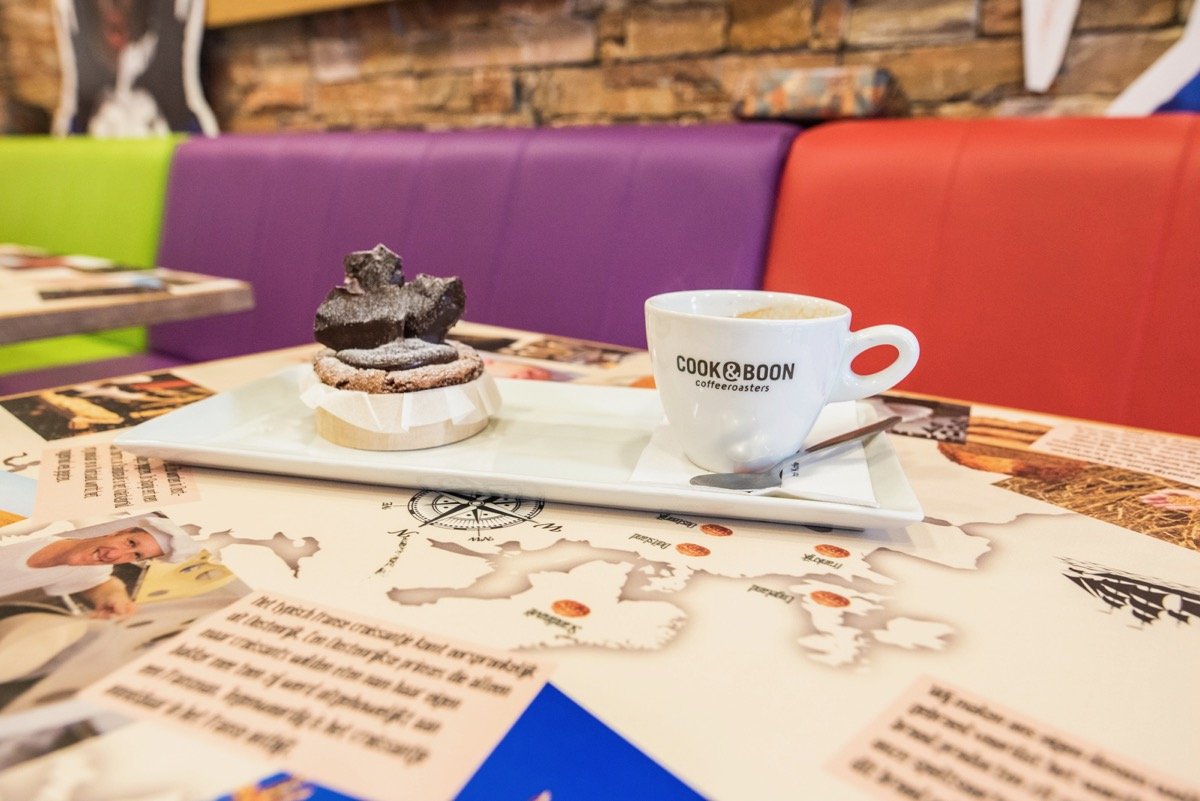 We bestellen een heerlijke kop koffie met daarbij een chocoladetaartje. De koffie is van Cook & Boon, een van onze favoriete kwaliteitskoffie's en dus een goede start van deze dag. De verkoopster vertelt ons dat al het brood dat gebakken wordt bij Kottier zonder gist of andere broodverbeteraars. Kwaliteit , persoonlijkheid, service, en diversiteit staan centraal bij Kottier. In de bakkerij wordt er veel handmatig gewerkt en volgens de traditionele waarden.