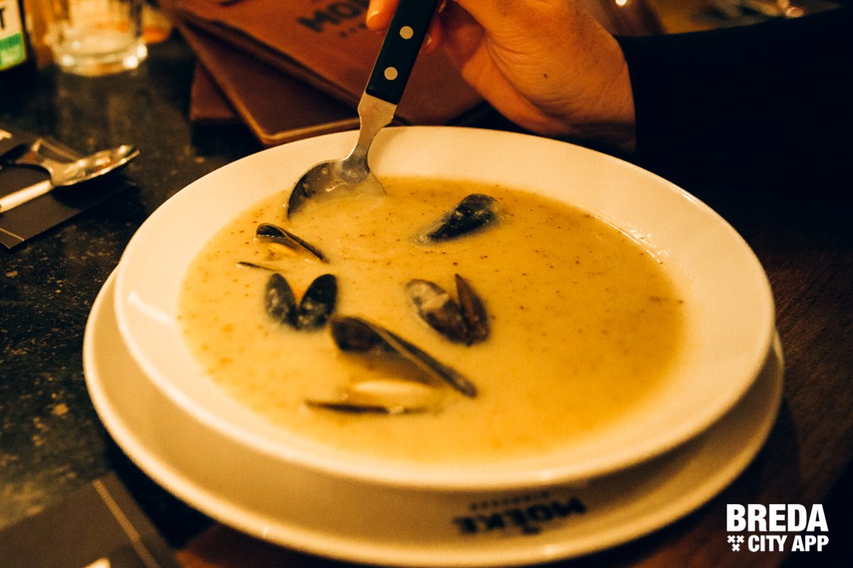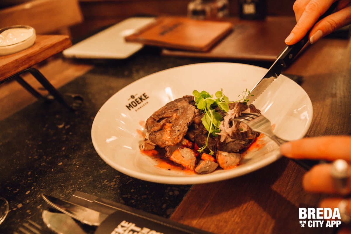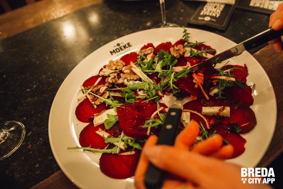 Moeke zit in een sfeervol historisch pand barstensvol prachtige oude elementen en heeft een rijke horeca historie. Zo zat hier eind 19e eeuw hotel Markzicht. Later had de familie Brouwer een café, en moeder de vrouw werd liefkozend ‘Moeke Brouwer’ genoemd. Een dorpskroeg met biljart, waar iedereen binnen kon stappen en waar het altijd gezellig was. Die sfeer wil de eigenaar vasthouden en dat is gelukt. Bourgondischer kan haast niet. We kiezen een lekkere IPA uit van de uitgebreide bierkaart en laten ons verder verrassen door de keuken.