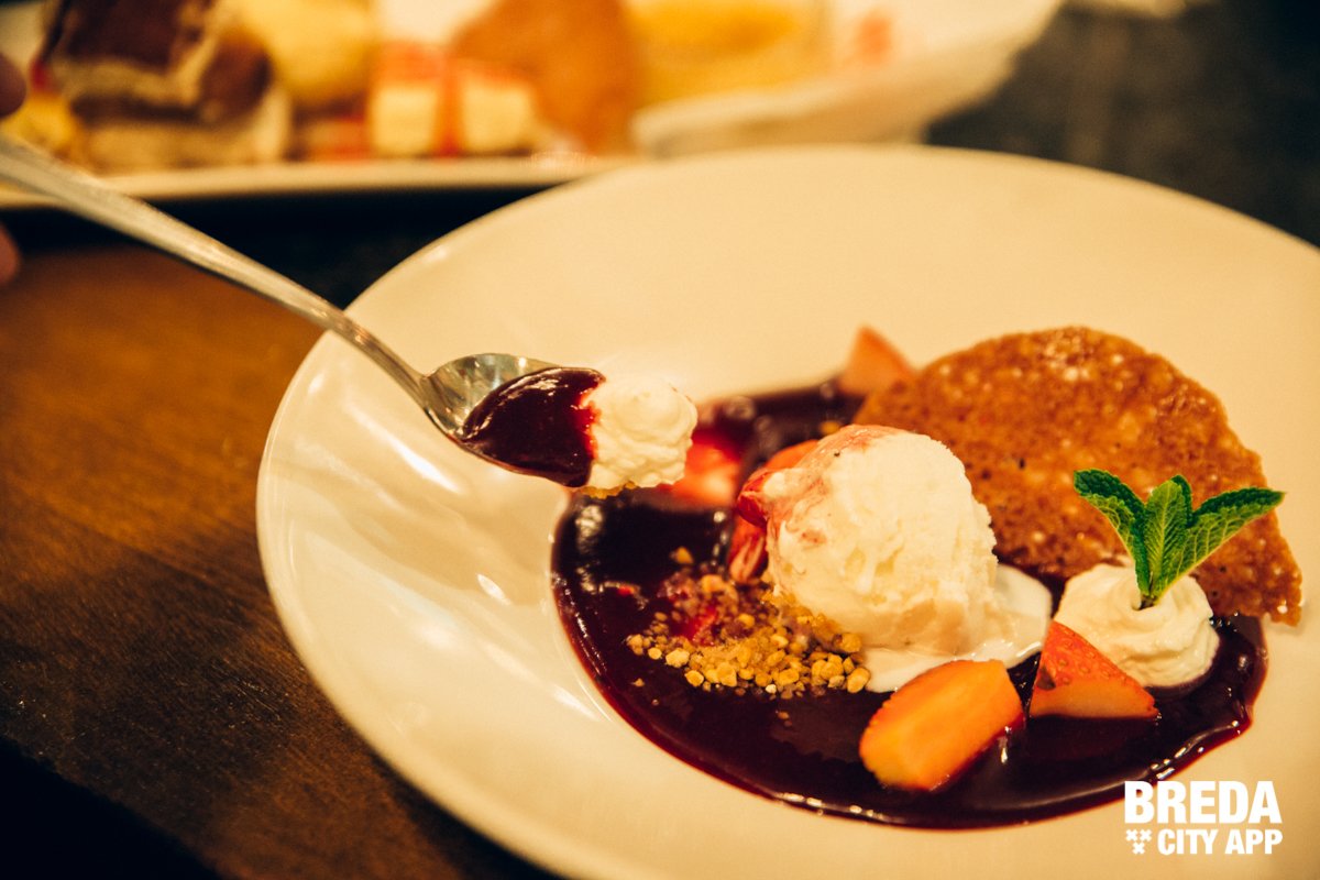 Tijd voor het dessert. We krijgen een assortiment van diverse nagerechten. Op een prachtig opgediend bord zien we een romige cheesecake, een mini crème brûlée, een zalig romige chocolade mousse met karamelsaus, een bolletje ijs en een Tiramisu. We mogen ook de ‘soep van rood fruit’ proeven. Dit krachtig fruitig nagerecht komt met een kletskop, vanille ijs en slagroom. Zalig!