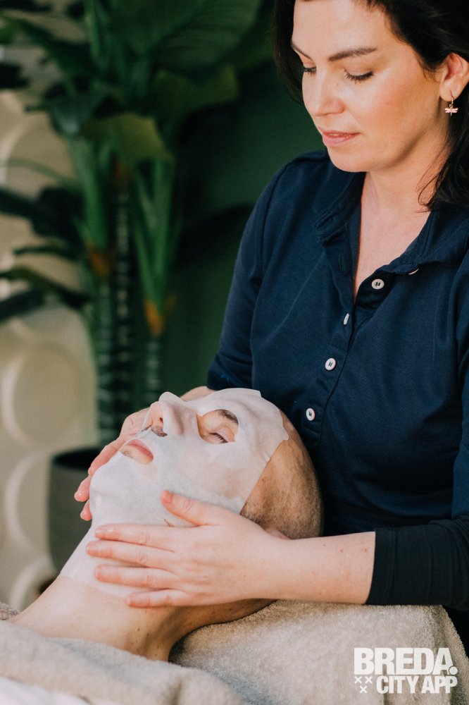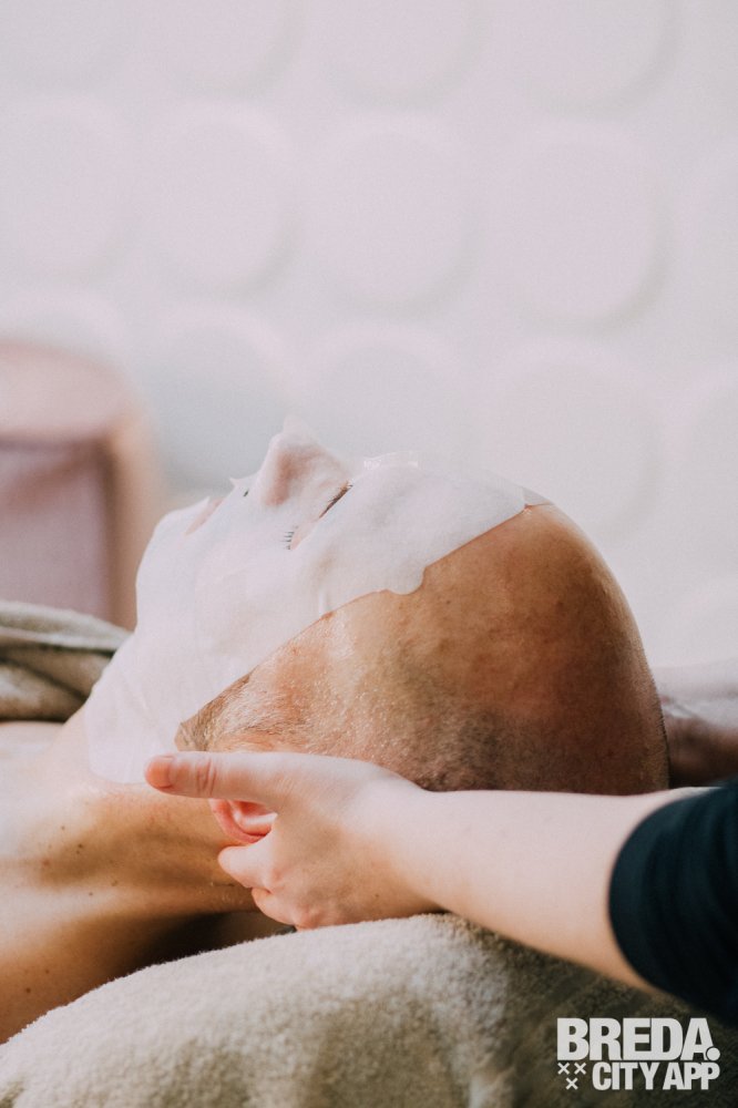 De behandeling nadert zijn einde en ik krijg nog een hydraterend masker op mijn gezicht. Ik blijf een minuut of tien alleen in de kamer achter terwijl het masker zijn werk doet. Mijn huid absorbeert het vocht, waardoor ik helemaal tot rust kan komen. Bertine maakt de behandeling af met een hoofdhuidmassage en verwijdert dan het hydraterende masker. Tot slot brengt ze met zorg enkele kleine druppeltjes onder mijn ogen aan. Dit is een speciale dag- en nachtcrème om het gebied rond mijn ogen extra te verzorgen.