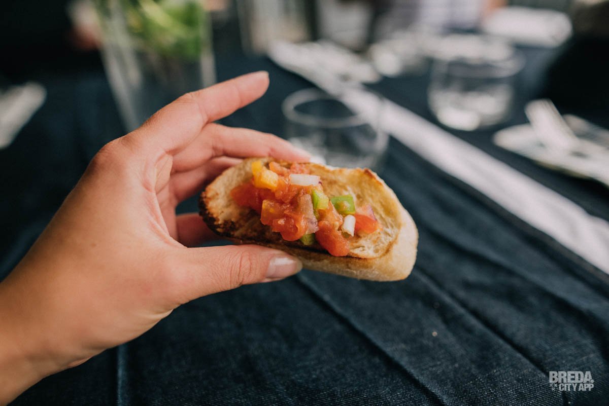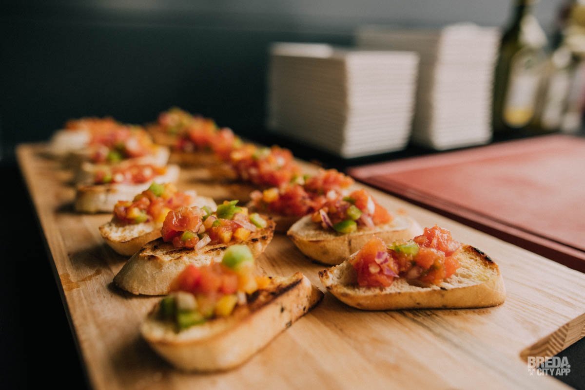 De vers bereide bruschetta's met tomaat, ui en paprika.