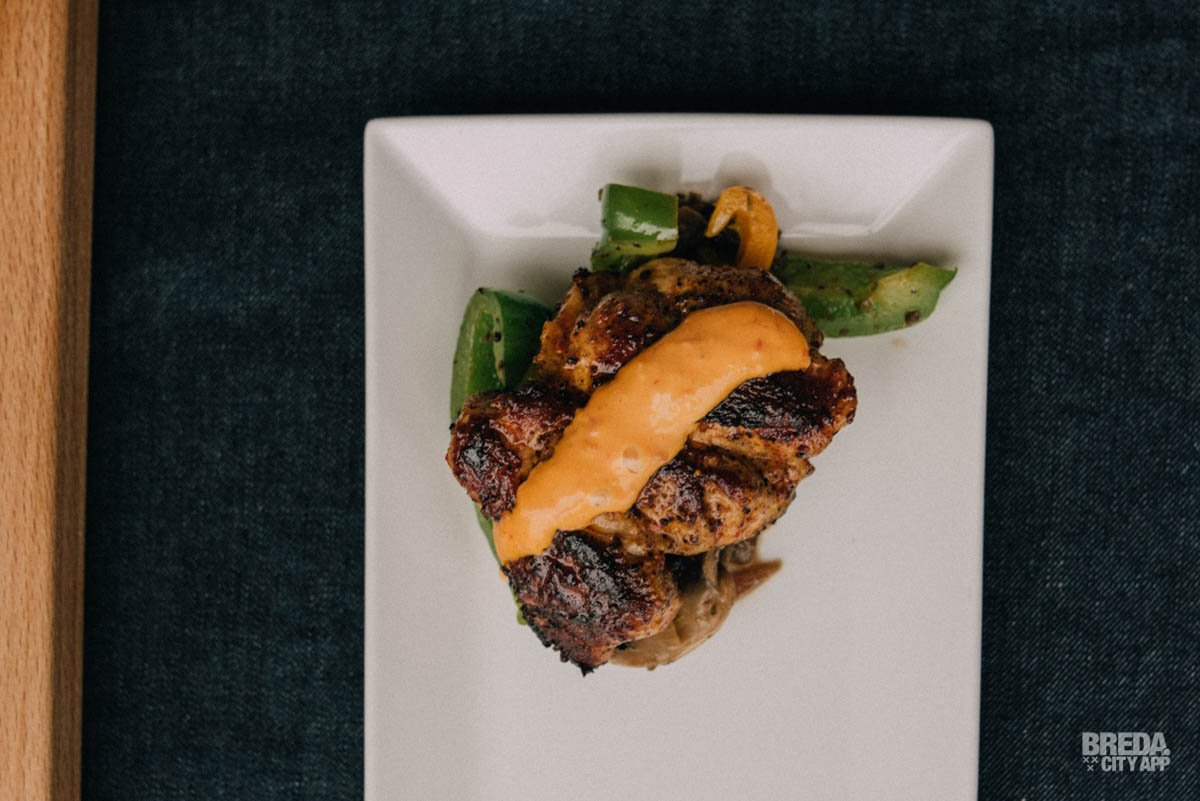 De kippendij met pittige saus en gegrilde, groene paprika.