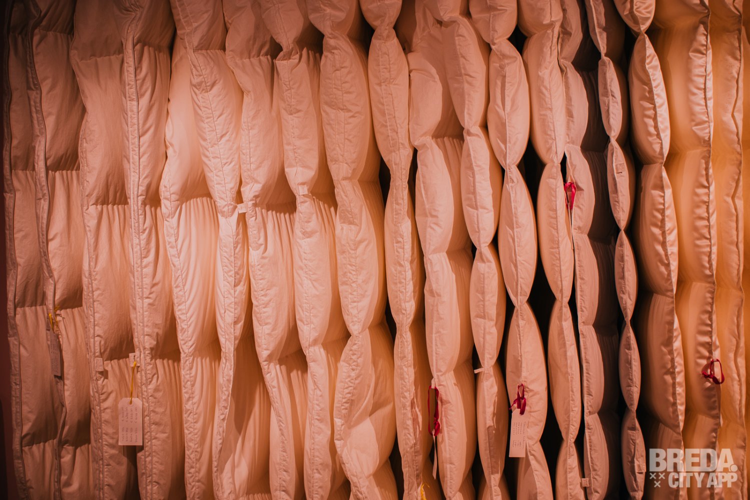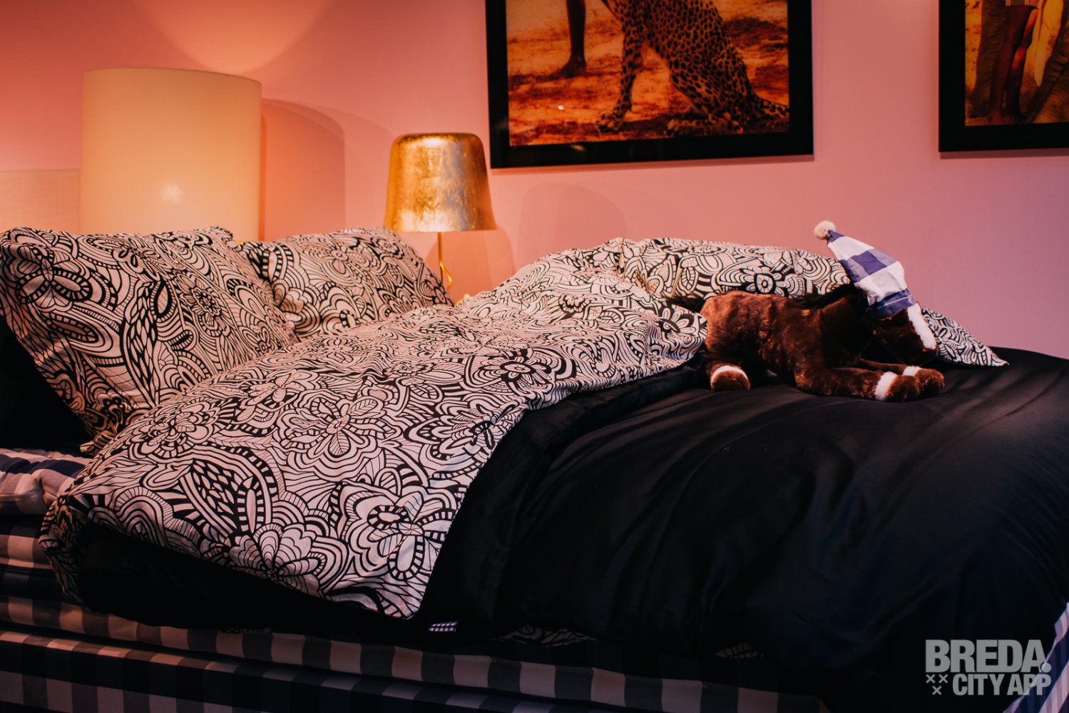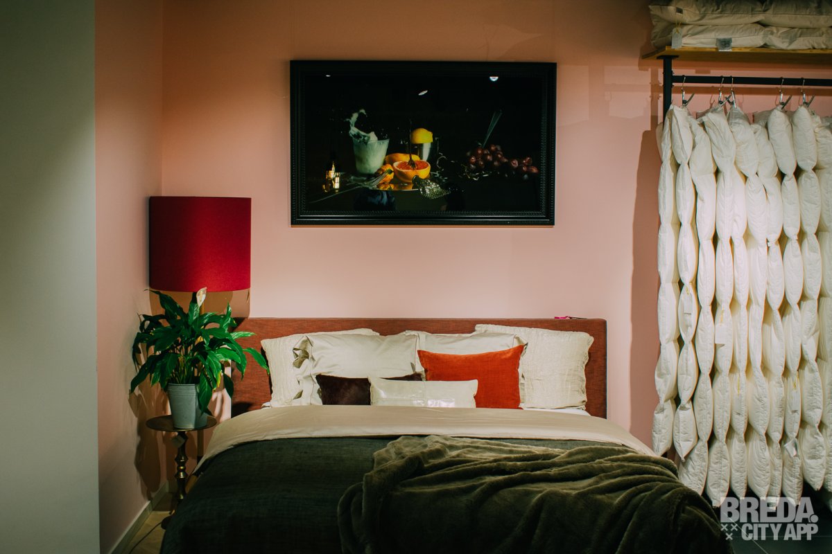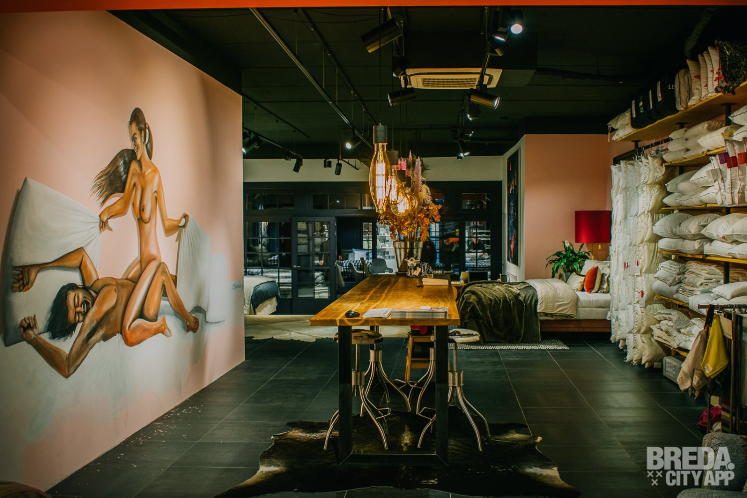We benoemden eerder al dat je humor ook terug ziet in de winkel. We treffen in de winkel namelijk ook de bedenker en schilder van ''Pillow Fight'' - Rik Gorree nog aan terwijl hij zijn finishing touch geeft aan een wel heel bijzonder kunstwerk. Bij binnenkomst zul je dan ook niet snel om de muurschildering van een in kussengevecht gewikkelde stoeiende naakte man en vrouw heen kunne. Wauw! Dit is zeker onderscheidend van andere slaapwinkels waar wij ooit geweest zijn. Want ja, een bed gebruik je natuurlijk niet alleen om te slapen ;)