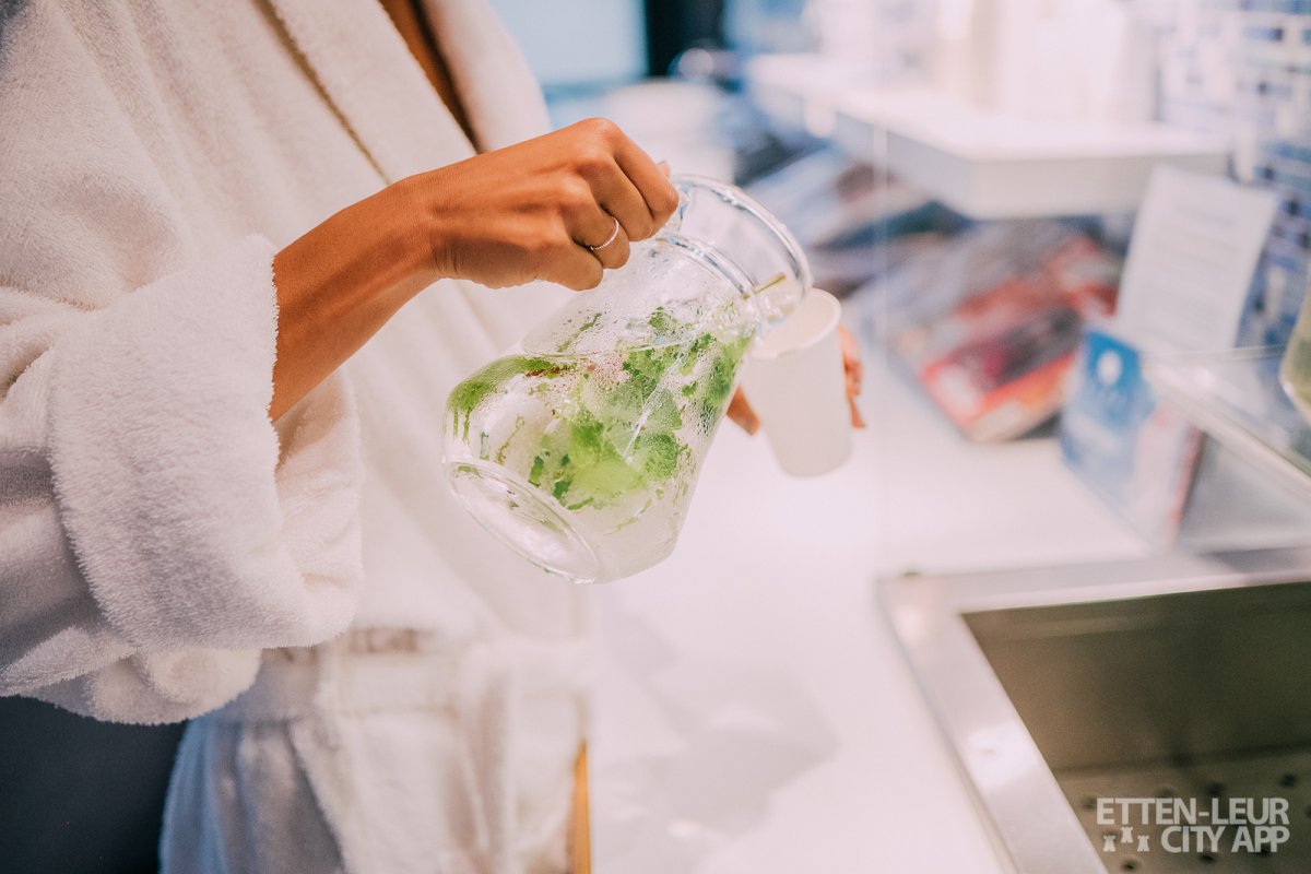 De wellness beschikt over een gezellige ruimte met tafels en luxe fauteuils, waar je eventueel ook een hapje en drankje kunt doen. Via de telefoon kun je zelf een bestelling maken bij het restaurant, waarna alles bij je aan tafel wordt geserveerd. Er staan ook kannen met gekoeld water en verse munt of sinaasappelen klaar.  Wat een luxe.