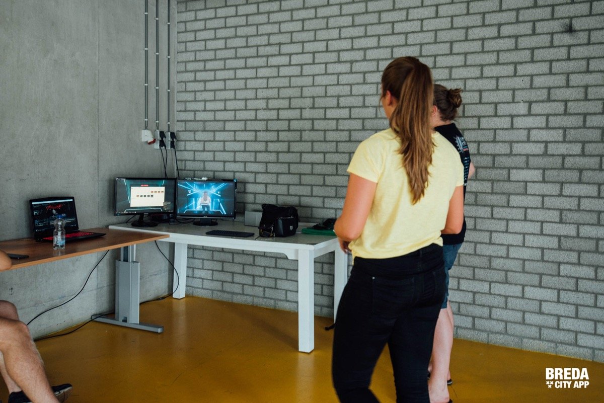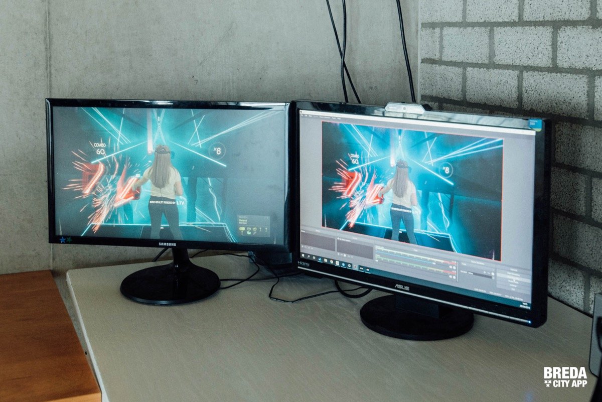 Het spel 'Beat Saber' is een spel waarbij er blokjes kapot geslagen moeten worden in een bepaalde richting. Naast dat je met de controllers de blokjes kapot moet slaan, moet je je ook naar de zijkant verplaatsen of bukken om de blokken te ontwijken. Je zit dus echt ín het spel.