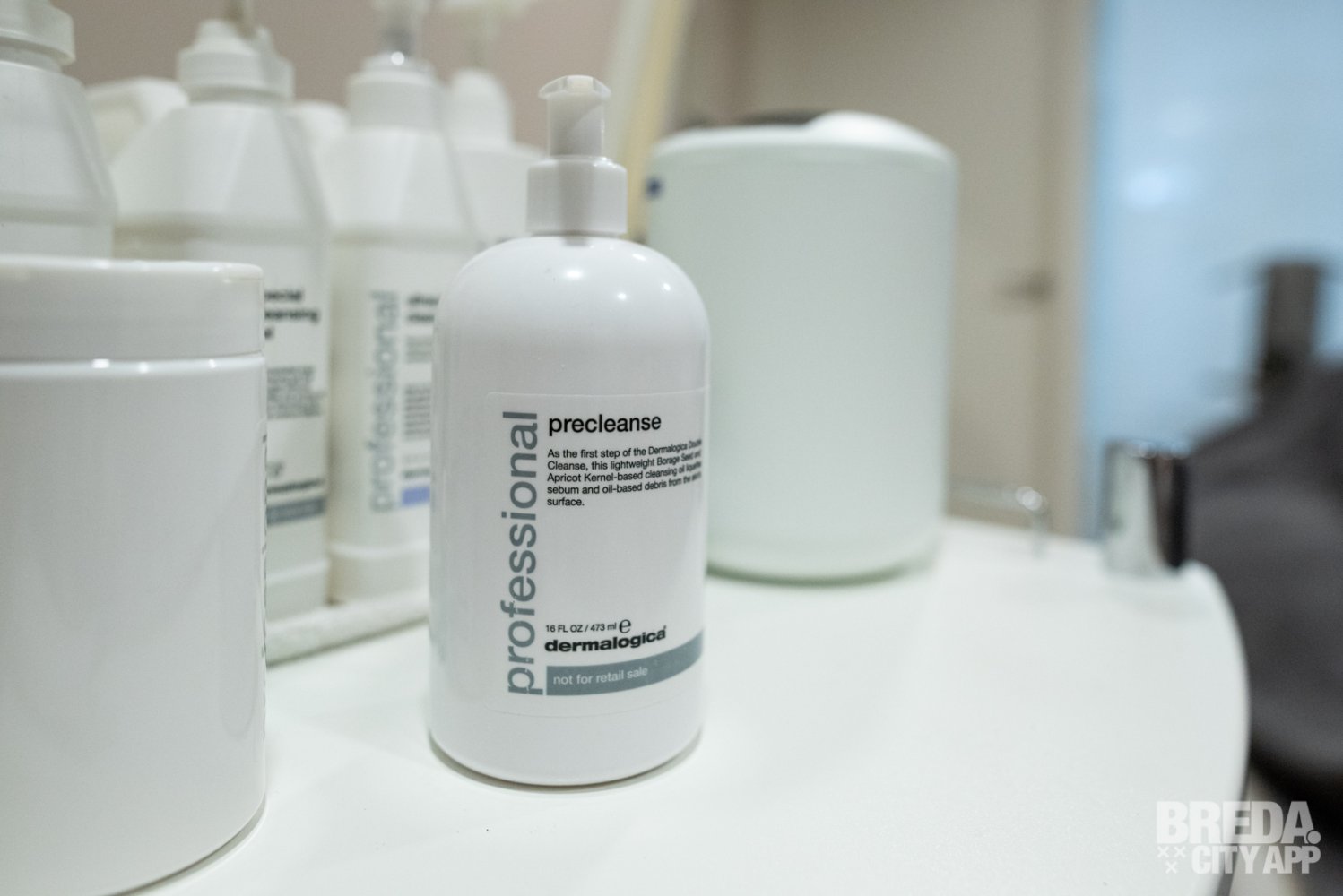 Als we klaar zijn met het doornemen van het formulier gaat de behandeling beginnen. Corné begint met het bekijken van mijn huid en besluit om mijn huid eerst grondig te gaan reinigen. Het eerste product dat hij hiervoor gebruikt is de Dermalogica Precleanse welke aangebracht en ingemasseerd wordt op mijn gezicht en hals. Hierna wordt mijn gezicht schoon gedept met een vochtige, warme handdoek. Het is volgens Corné erg belangrijk om je gezicht goed te reinigen, zodat je vervolgens met een 'schone lei' kan beginnen (of eindigen).