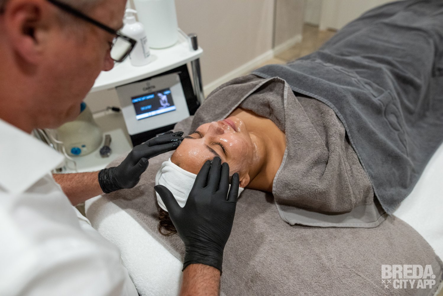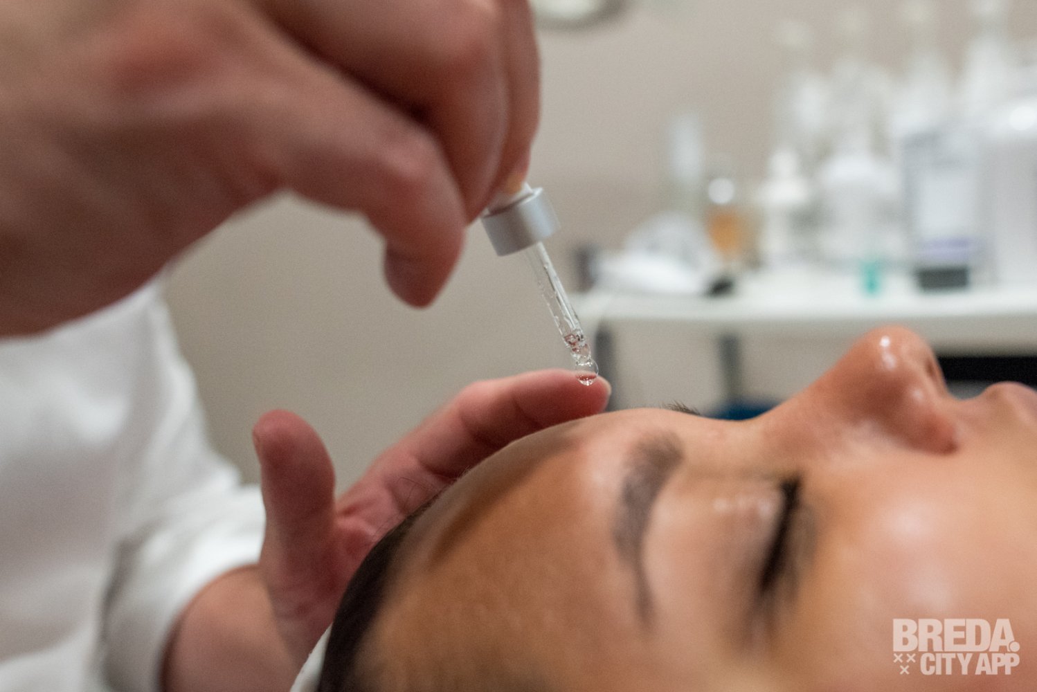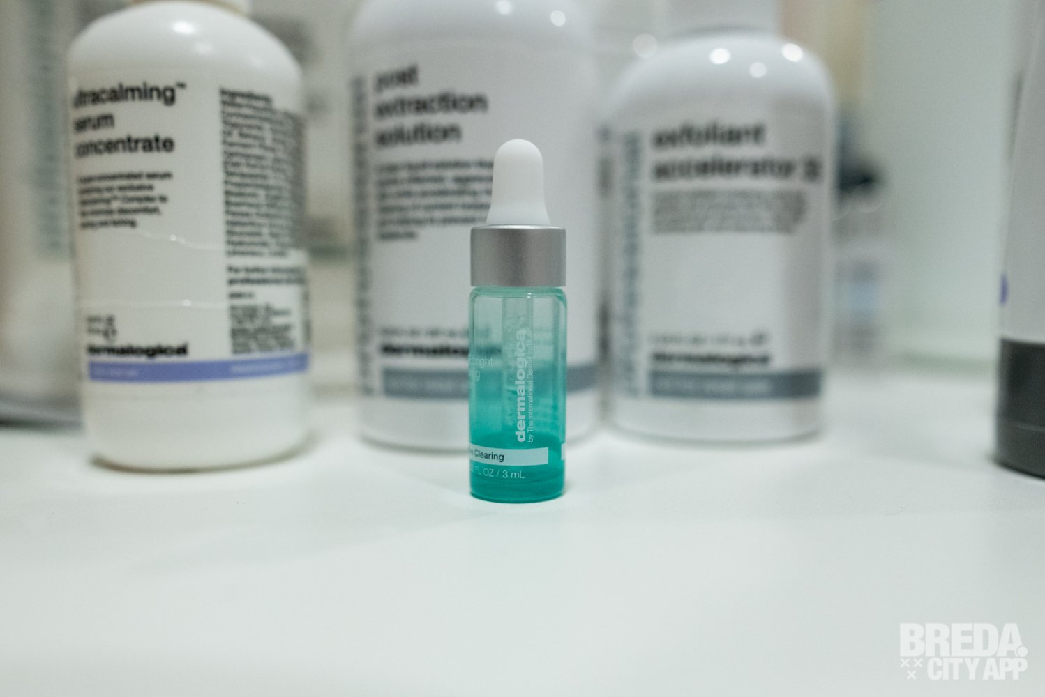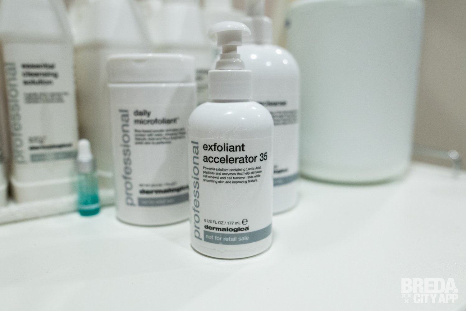 Hierna voelt mijn huid al een stuk schoner en frisser, wat aangeeft hoe belangrijk het is om je huid goed te behandelen en verzorgen. Het volgende product dat aangebracht wordt op mijn gezicht is de Dermalogic Exfoliant Accelerator 35. Dit product bevat melkzuur, peptiden en enzymen die ervoor zorgen dat de huidcellen vernieuwen, waardoor de textuur van je huid verbetert en zachter wordt. Het kan een beetje prikken op je huid, maar dat wil zeggen dat het melkzuur zijn werk doet. Corné masseert dit product meerder malen goed in op mijn gezicht en hals voordat we doorgaan naar de volgende stap.