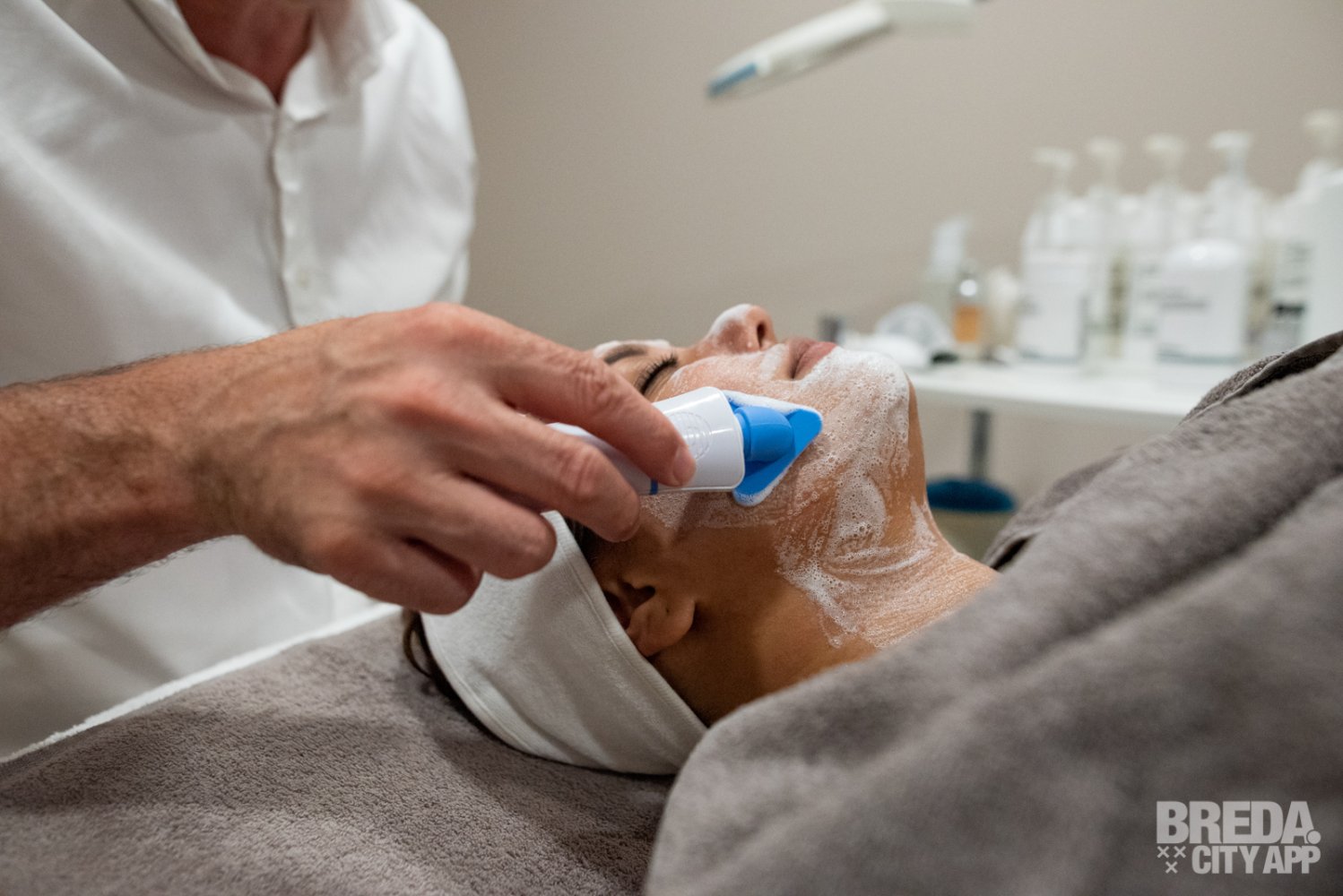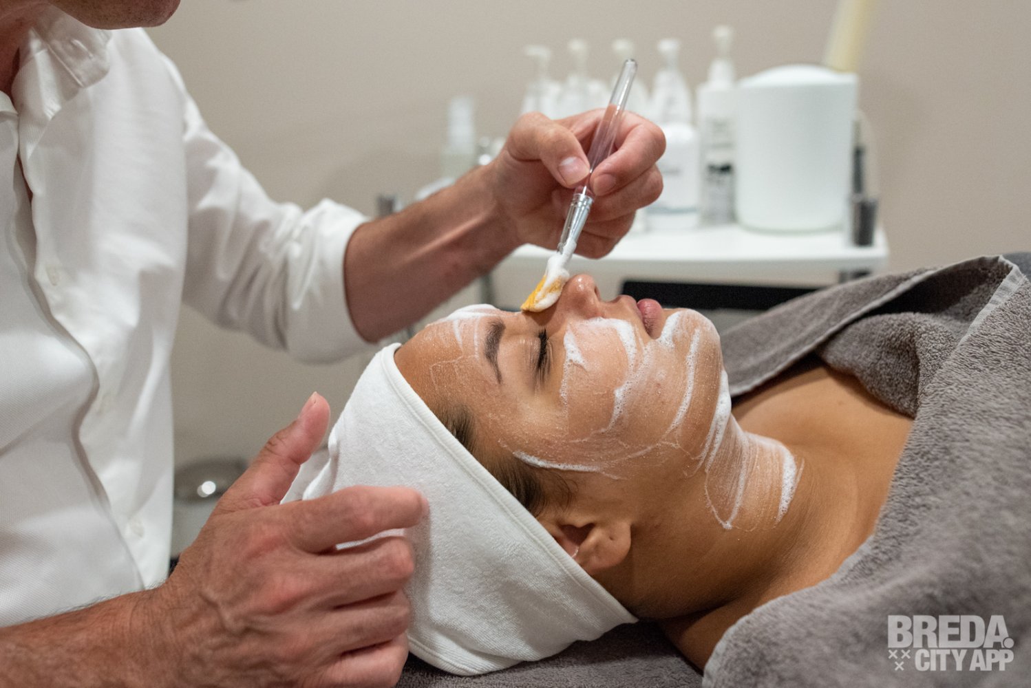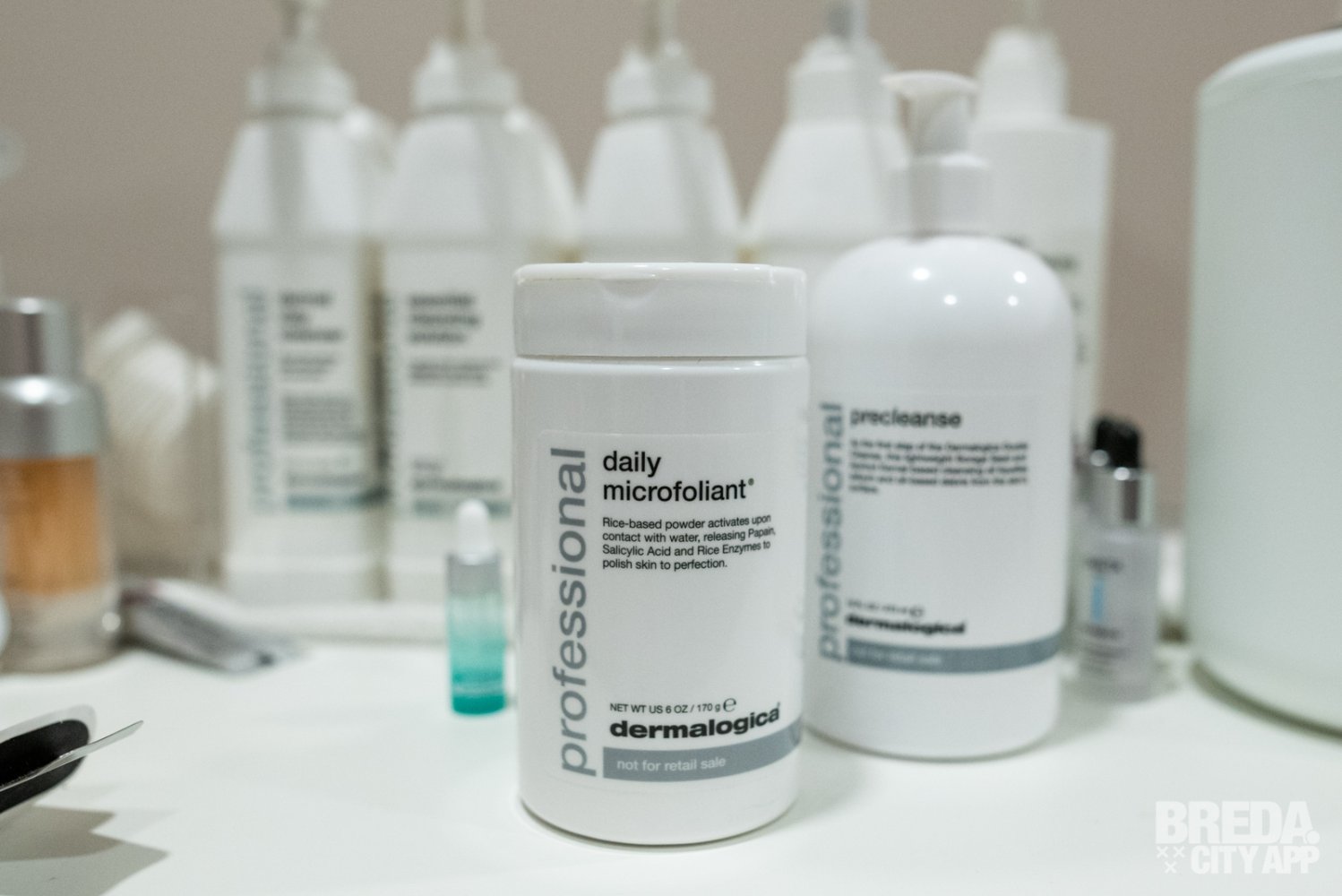Hierna voelt mijn huid al een stuk schoner en frisser, wat aangeeft hoe belangrijk het is om je huid goed te behandelen en verzorgen. Het volgende product dat aangebracht wordt op mijn gezicht is de Dermalogic Exfoliant Accelerator 35. Dit product bevat melkzuur, peptiden en enzymen die ervoor zorgen dat de huidcellen vernieuwen, waardoor de textuur van je huid verbetert en zachter wordt. Het kan een beetje prikken op je huid, maar dat wil zeggen dat het melkzuur zijn werk doet. Corné masseert dit product meerder malen goed in op mijn gezicht en hals voordat we doorgaan naar de volgende stap.