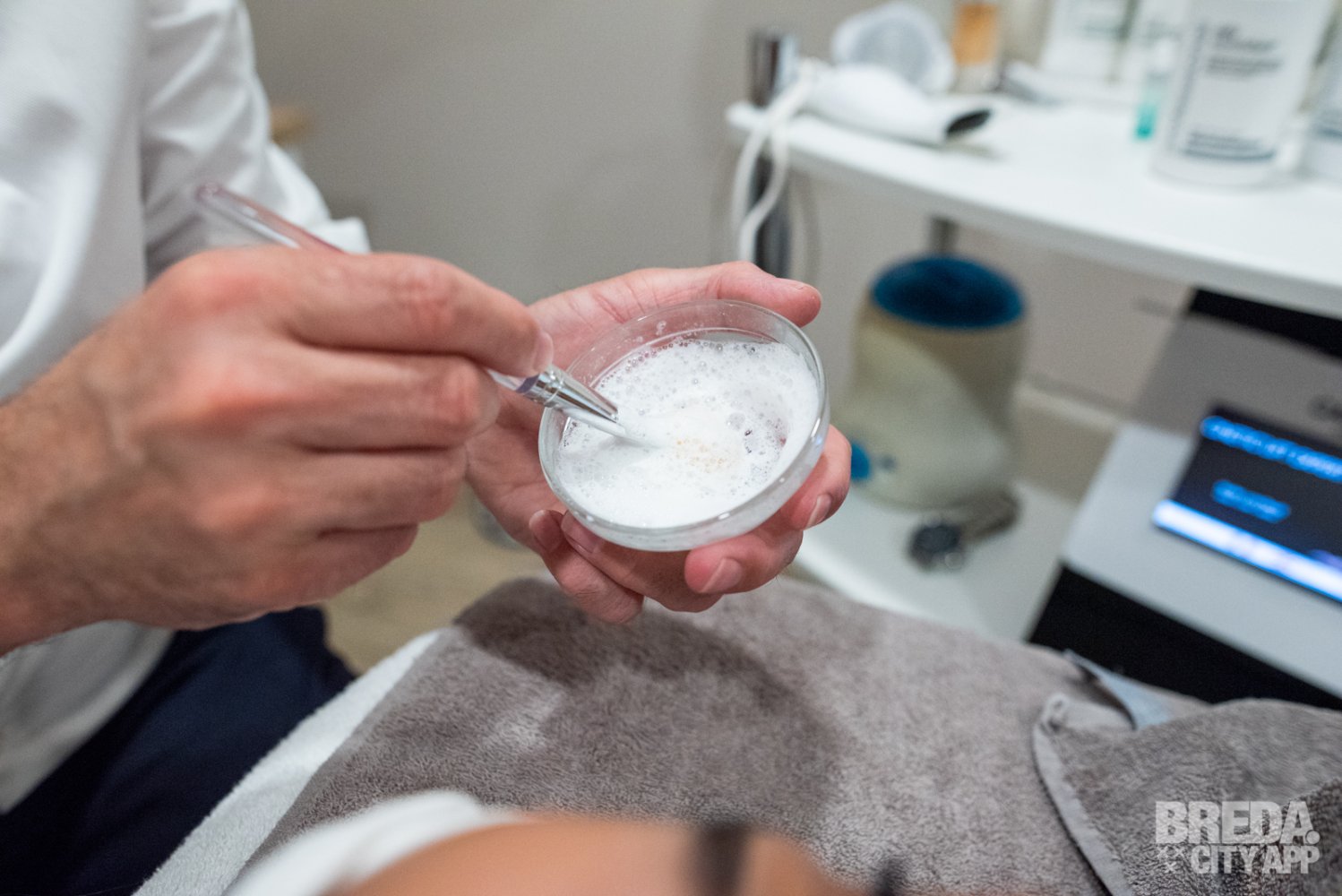 Na de cleansers gaat Corné aan de slag met het volgende product genaamd Dermalogica Daily Microfoliant. Dit product, dat dagelijks gebruikt kan worden, komt in poedervorm. Je hebt een theelepeltje per keer nodig en als je water aan het poeder toevoegt wordt het geactiveerd. Corné brengt dit mengsel aan op mijn gezicht met een kwastje en vervolgens wordt dit ingemasseerd met een elektrisch, siliconen borsteltje. Hij gebruikt dit zodat het product nog effectiever werkt op de huid.