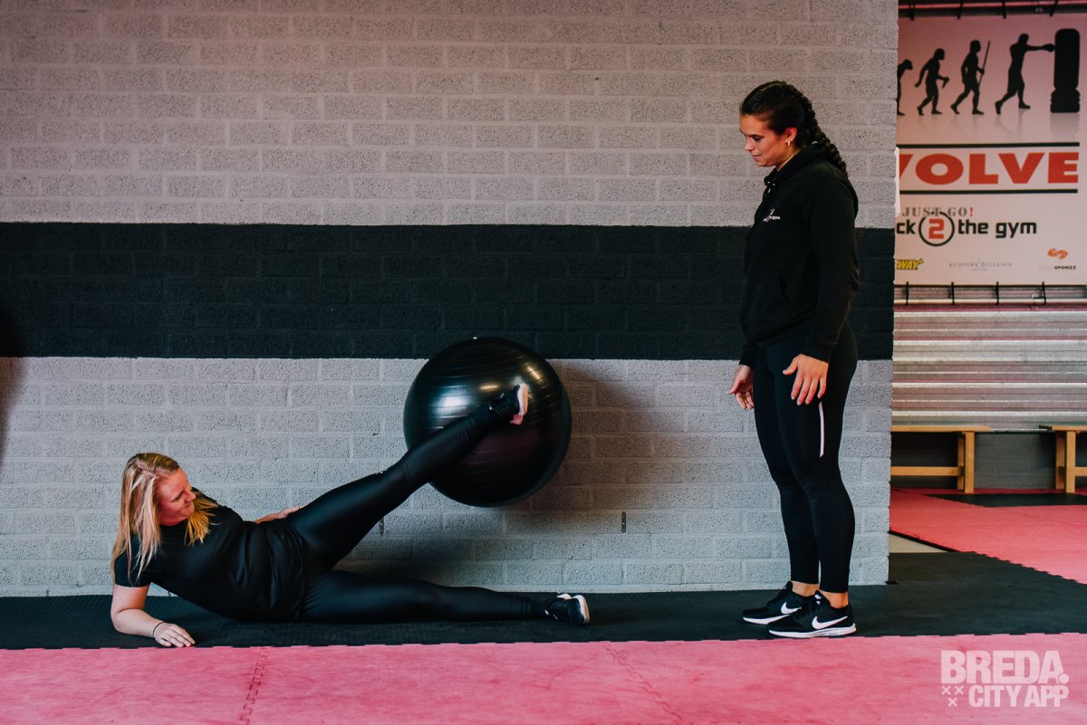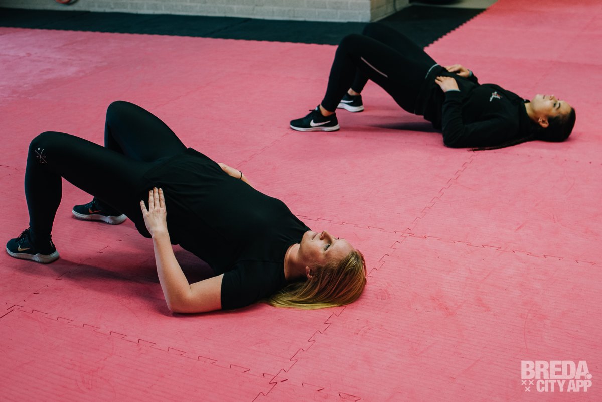 Daarna gaan we verder met de squat sit-up, de naam zegt het al dit is een combinatie van een squat en een sit-up waarbij je op je knieën op de grond zit. We sluiten de ronde af met een glute bridge. Dit is één van de beste oefeningen voor sterke en ronde billen. Het is makkelijk uit te voeren, maar zeker goed te voelen! Chessy is een ontzettend fijne coach en zorgt ervoor dat ik alle drie de rondes goed kan uitvoeren en niet opgeef!