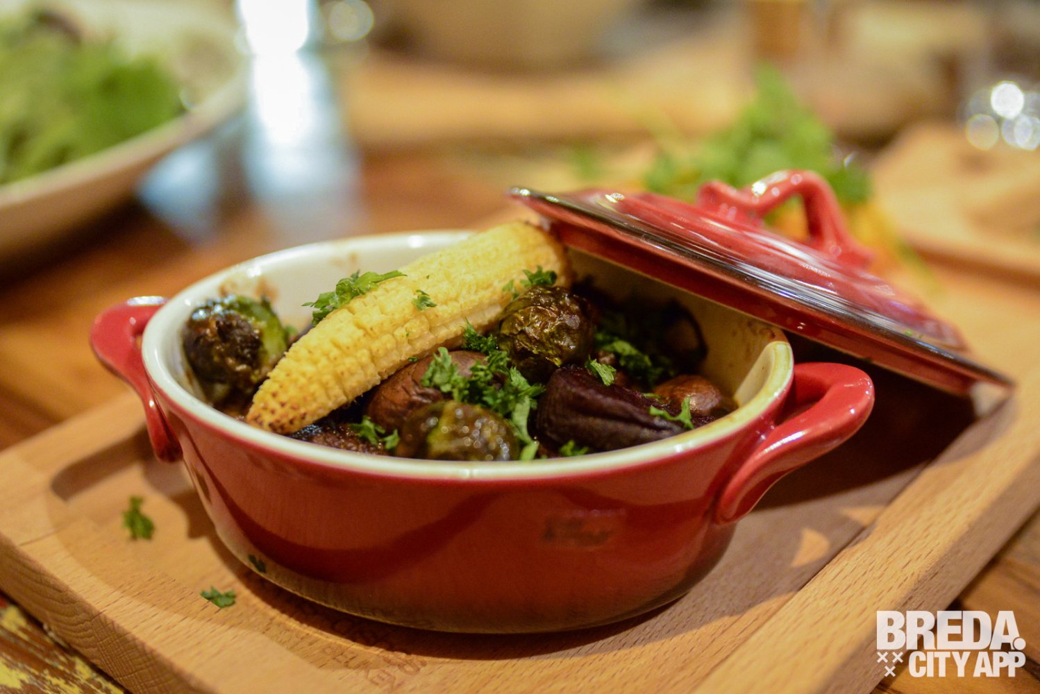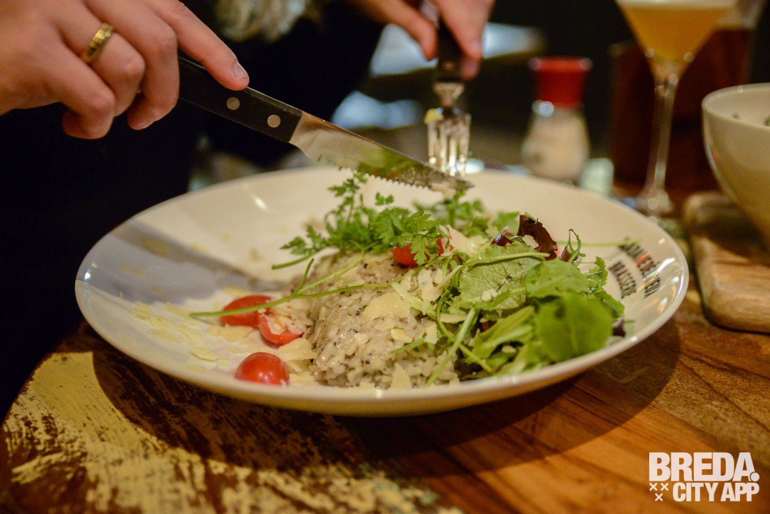 We kiezen een hoofdgerecht van de kaart. De gerechten zijn bourgondisch en toegankelijk te noemen en zijn veelal geïnspireerd op de Franse keuken met wederom keuze voor vis, vlees en vega. Alle hoofdgerechten worden geserveerd met groenten, salade en wedges (welke heerlijk gekruid en lekker krokant blijken te zijn). Mijn vriendin kiest voor de (vegetarische) truffelrisotto en ik vind het op deze koude decemberdag de hoogste tijd om het stoofpotje te proberen. Hierbij nemen we beiden een glaasje biologische Tempranillo. De gerechten zien er erg smaakvol uit en de porties zijn ruim. Het stoofvlees (welke gepresenteerd is in een traditioneel stoofpannetje) is ontzettend smeuïg en de stamppot goed van smaak. De truffelrisotto met bimi, paddenstoel, mascarpone en pompoen is romig en de combinatie van truffel en Parmezaanse kaas is voortreffelijk.