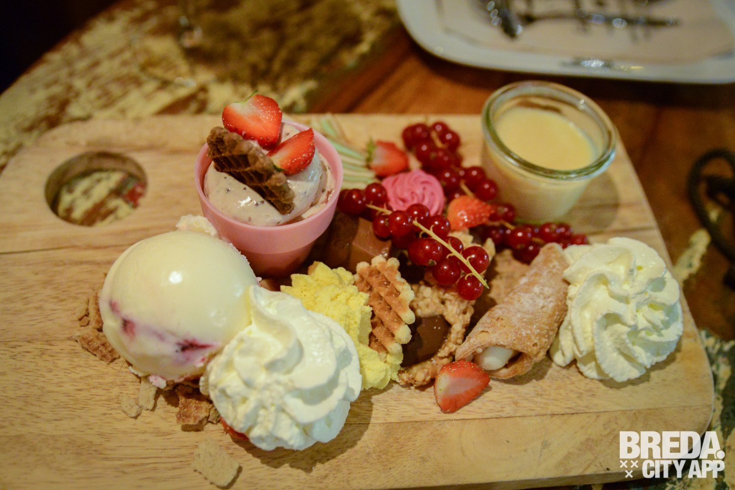 Het zoete proeverijtje is weer fantastisch gepresenteerd en bestaat uit verschillende elementen, waaronder yoghurt-/kersenijs, vanille bavarois, spekkoek, pana cotta, straciatella mousse, bonbons en cannoli. Echt een feestje voor de zoetekauw onder ons!