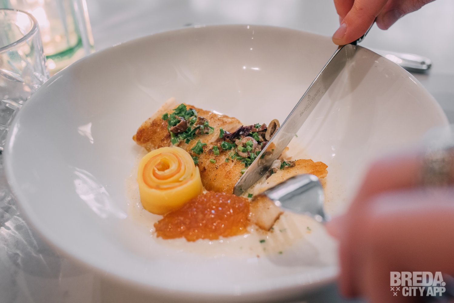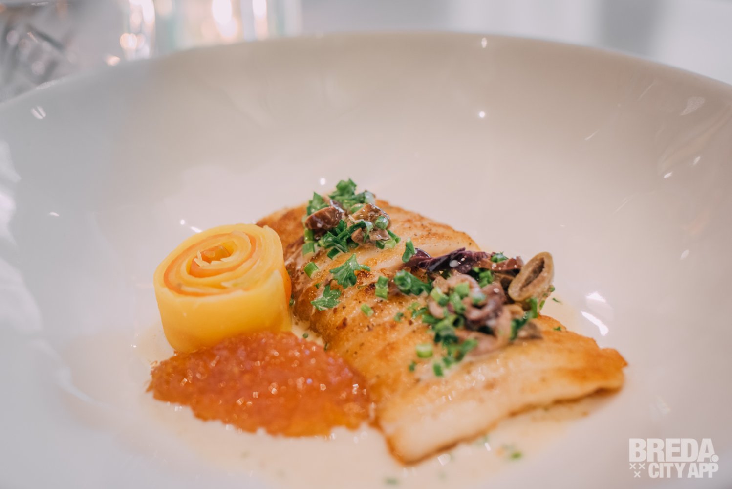 Het andere voorgerecht bestaat uit een rogvleugel met een compote van sjalotten, 2 kleuren gepofte wortel en beurre Blanch met olijf, ansjovis en bieslook. Nog nooit eerder hebben we rogvleugel geprobeerd en we zijn onder de indruk wanneer we een hapje proeven. De rogvleugel heeft een stevige structuur en heeft een mooi licht krokant laagje. De zoete maar toch frisse compote zorgt voor een goede smaaksensatie.