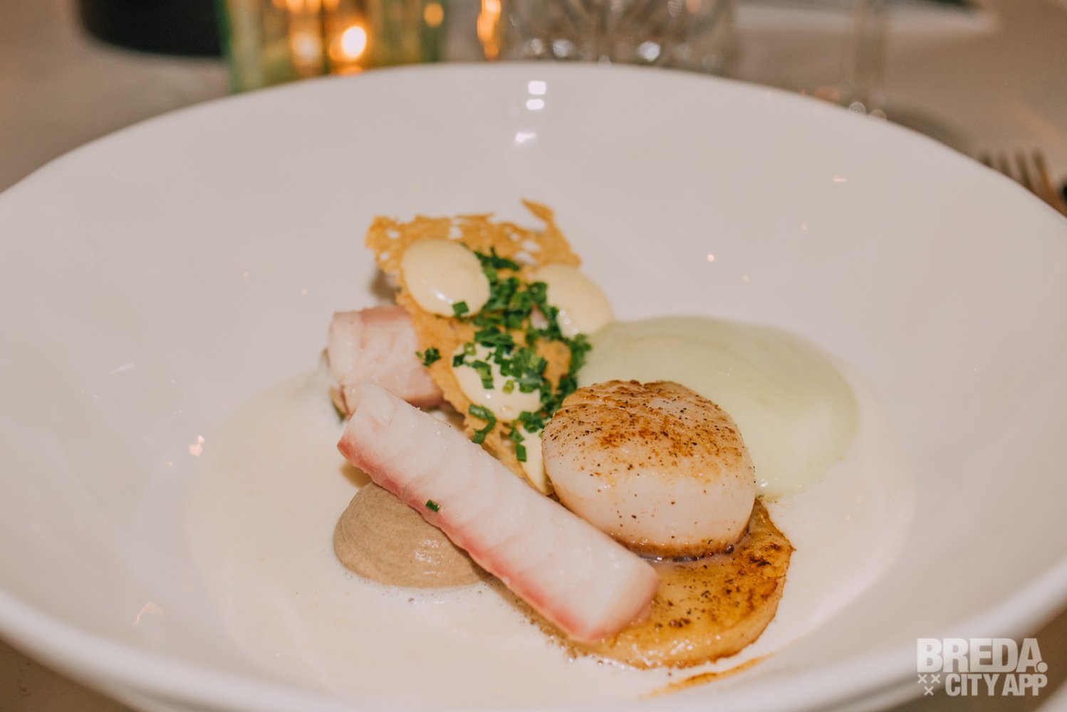 Terwijl we nog aan het genieten zijn van onze glaasjes met bubbels proeven we de verschillende amuses die geserveerd worden. We proeven eerst de tartelette met flan van doperwert, asperge en gefrituurde peterselie. Tartelette is een soort klein koekbakje dat gevuld kan worden met bijvoorbeeld de flan die wij geserveerd kregen. De smaak is erg fris en je proeft de doperwt er goed in terug. De tweede amuse bestaat uit een bakje gemaakt van filodeeg met crème van geitenkaas en dragon, gemarineerde cherrytomaat afgetopt met limoengel. De smaak van de geitenkaas komt goed naar voren en de limoengel zorgt voor de frisse bite aan deze amuse. Wat is dit genieten! Eventjes later brengt Enya ons nog een schaaltje gevuld met vers gebakken zuurdesembrood met roomboter en dukkah. Het brood is lekker knapperig en perfect in combinatie met de gezouten roomboter. Dukkah is een mengsel van noten en Midden-Oosterse specerijen die zijn oorsprong vindt in Egypte. Je proeft de hazelnoten goed terug in de Dukkah en ook de kruiden zorgen voor een goede taste.