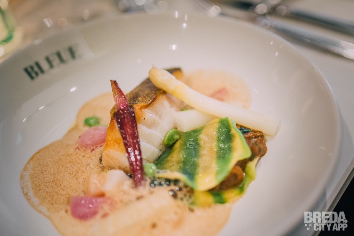 Ook het tweede hoofdgerecht overtreft onze verwachtingen. Wederom een kleurrijk gerecht bestaande uit kabeljauw, open ravioli met Hollandse garnaal en spinazie, crème van artisjok en schaaldieren saus. De witte vis is erg zacht en valt goed in de smaak samen met de crème van artisjok. Dit zorgt voor een luchtig gerecht. In de ravioli proef je goed de Hollandse garnaal en spinazie terug. Wat een genot!