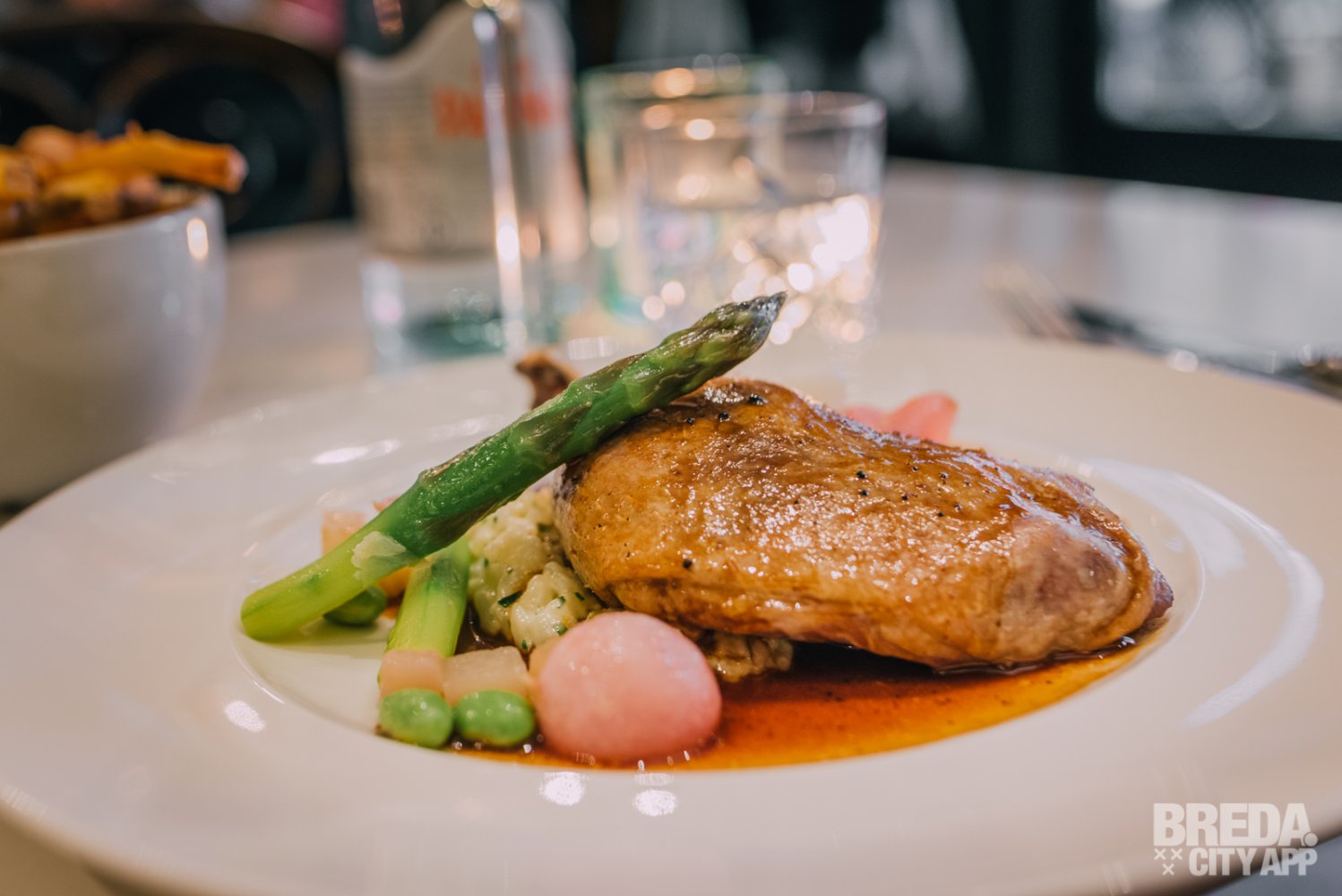 Enya komt aanlopen met onze hoofdgerechten en wat zien ze er heerlijk en kleurrijk uit! Het hoofdgerecht dat geserveerd wordt bestaat uit een confit de canard van boerderij eend met risotto en truffel jus. De boederij eend is lekker mals en valt zo van het bot af. De smaak is intens en verfijnd en voldoet aan de verwachtingen die wij hebben bij de Franse keuken. Opgemaakt met de seizoensgroente; asperge, de risotto en truffeljus is het een ware smaakexplosie.
