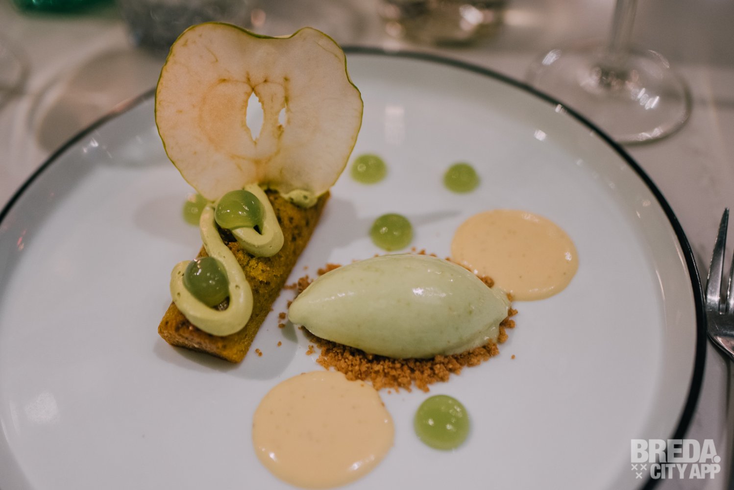 We sluiten dit verassing diner af met een nagerecht bestaande uit een gâteau pistache; een pistache-chiazaad cakeje met appel sorbet, zoethout crumble, matcha mascarpone, appel gel en een vanille tonkaboon saus. Het nagerecht waant zich volledig in de geuren en kleuren van de pistachenoot. Deze smaak proef je dan ook goed terug in het gerecht. Het cakeje met chiazaad is erg luchig en heeft een zachte structuur. Het sorbet ijs is lekker fris en de crumble zorgt voor een lekkere bite.