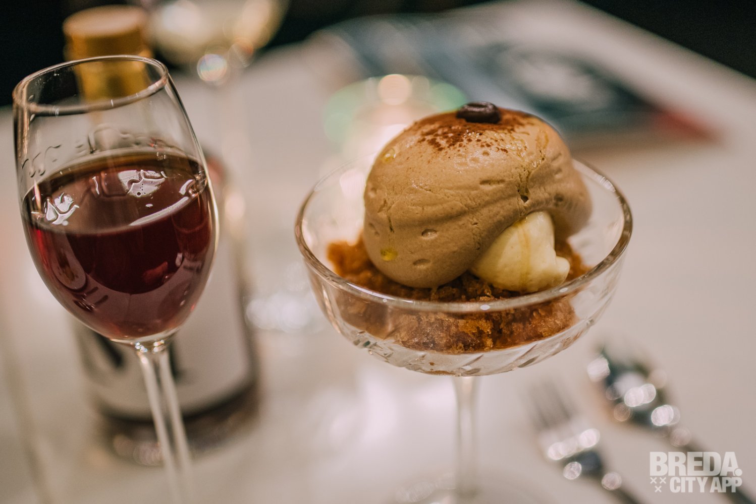 Het andere nagerecht is een speciale tiramisu. De tiramisu bestaat uit koffie roomijs, granité en ganache. Granité is een halfbevroren zoete drank met in dit geval de smaak van koffie. De granité zorgt ervoor dat de tiramisu niet zo zwaar op de maag valt en lekker fris is. De ganache heeft een heerlijke zachte en tegelijkertijd zoete smaak van binnen.