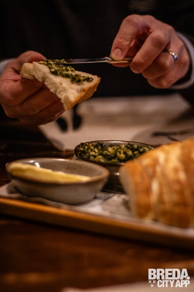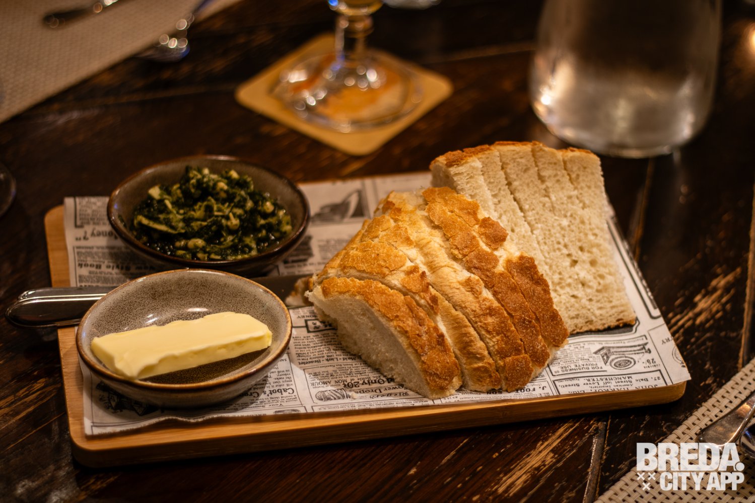 We krijgen de vers getapte La Trappe blond en een Swinckels uitgeserveerd met nootjes in een glaasje. Daarnaast krijgen we vers brood met pesto en boter. Een prettige starter. We bekijken het week menu en besluiten beide hiervoor te gaan.