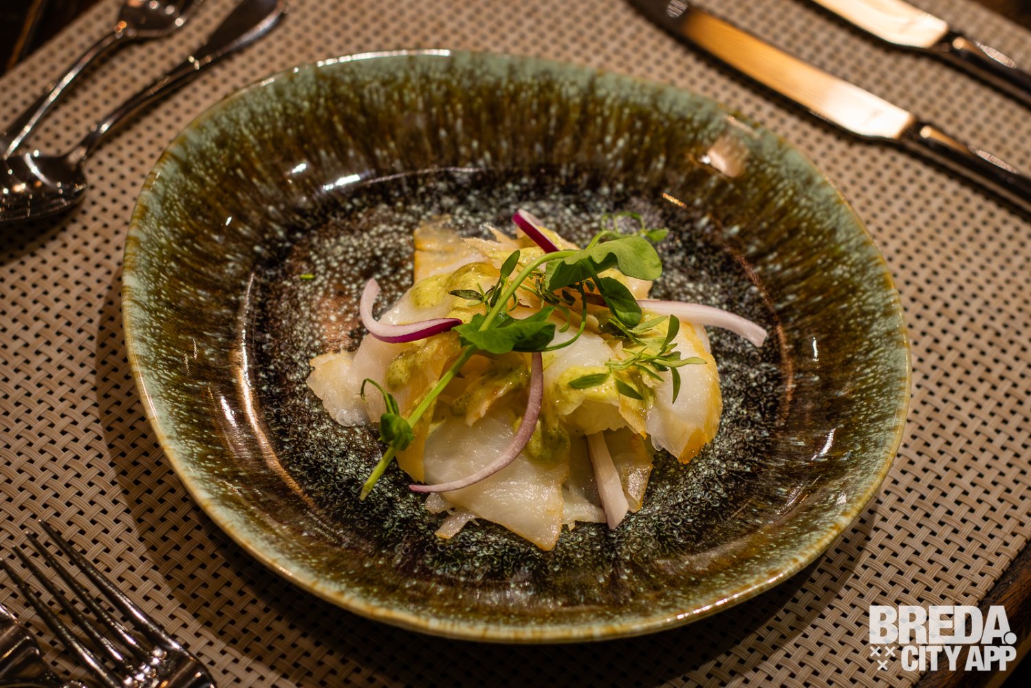 Mijn bord onthult een kunstig opgemaakt gerecht van gerookte heilbot, verfraaid met basilicum en citrus accenten. De borden zijn visueel aantrekkelijk, en de smaken stellen ons niet teleur.