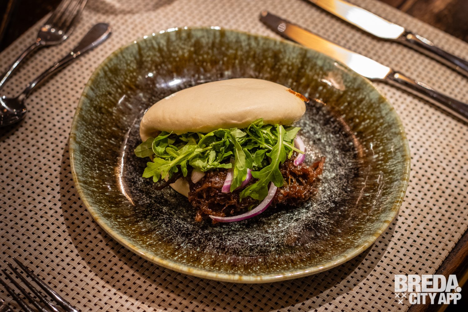 Ons smaakavontuur begint met gestoomde bapaobuns, rijkelijk gevuld met pulled hert en vergezeld door rode ui en een typische Korean saus.