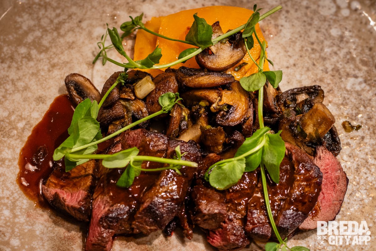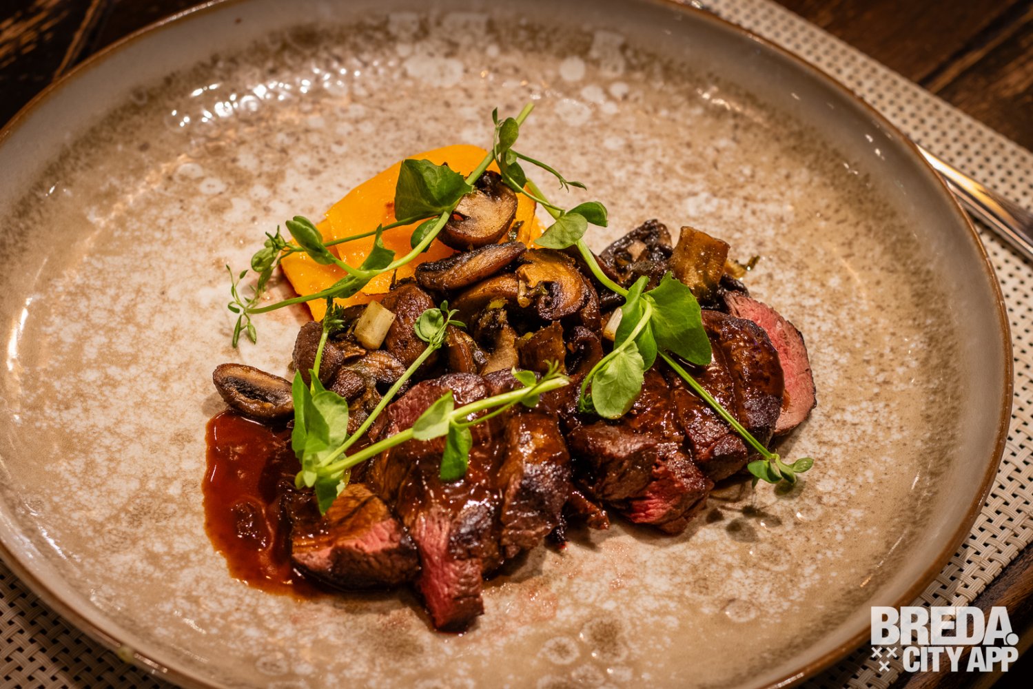 Voor mij verschijnt een klassieker in een herfstjasje: malse kangaroebiefstuk met gestoofde pompoen, kastanjechampignons en een zachte rode wijnsaus. De hoofdgerechten smaken ontzettend goed.