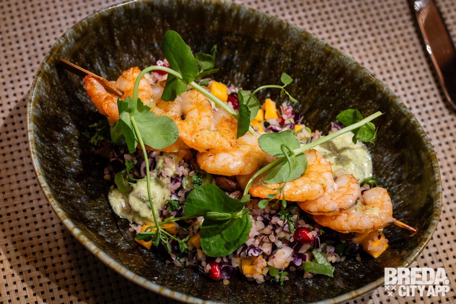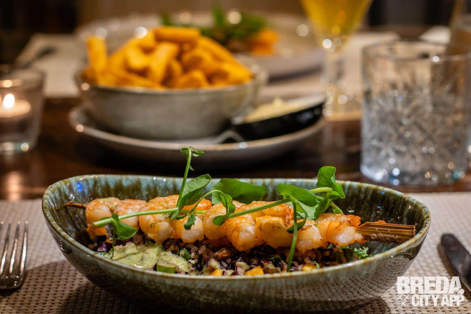 Een nieuwe biervariant vergezelt ons tussen de gangen door nadat onze borden zijn uitgehaald. De gerechten worden vloeiend geserveerd. We krijgen als hoofdgerecht de gamba spies met pesto en de lauwwarme bulgar salade. Een harmonieuze smaaksensatie wat ook smaakvol is opgemaakt in het mooie service.