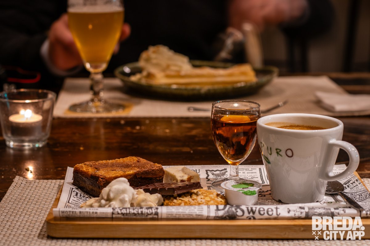 De verwenkoffie die ik krijg, onthult een assortiment lekkernijen uit de keuken. Op het plankje ligt een stroopwafelbrownie, witte chocolade pindarotsjes en andere kleine heerlijkheden. Mijn aandacht wordt getrokken naar een klein likeurglaasje. De geur van een plaatselijke delicatesse genaamd Beecks Boemeltje verleiden mijn zintuigen. Een zachte verleiding voor mijn smaakpapillen laat me nagenieten van dit heerlijke weekmenu.