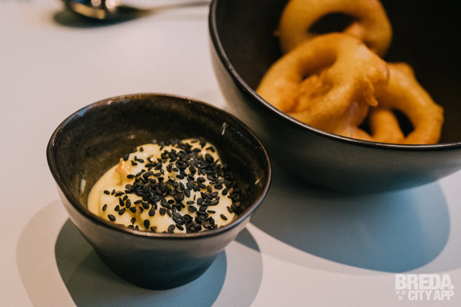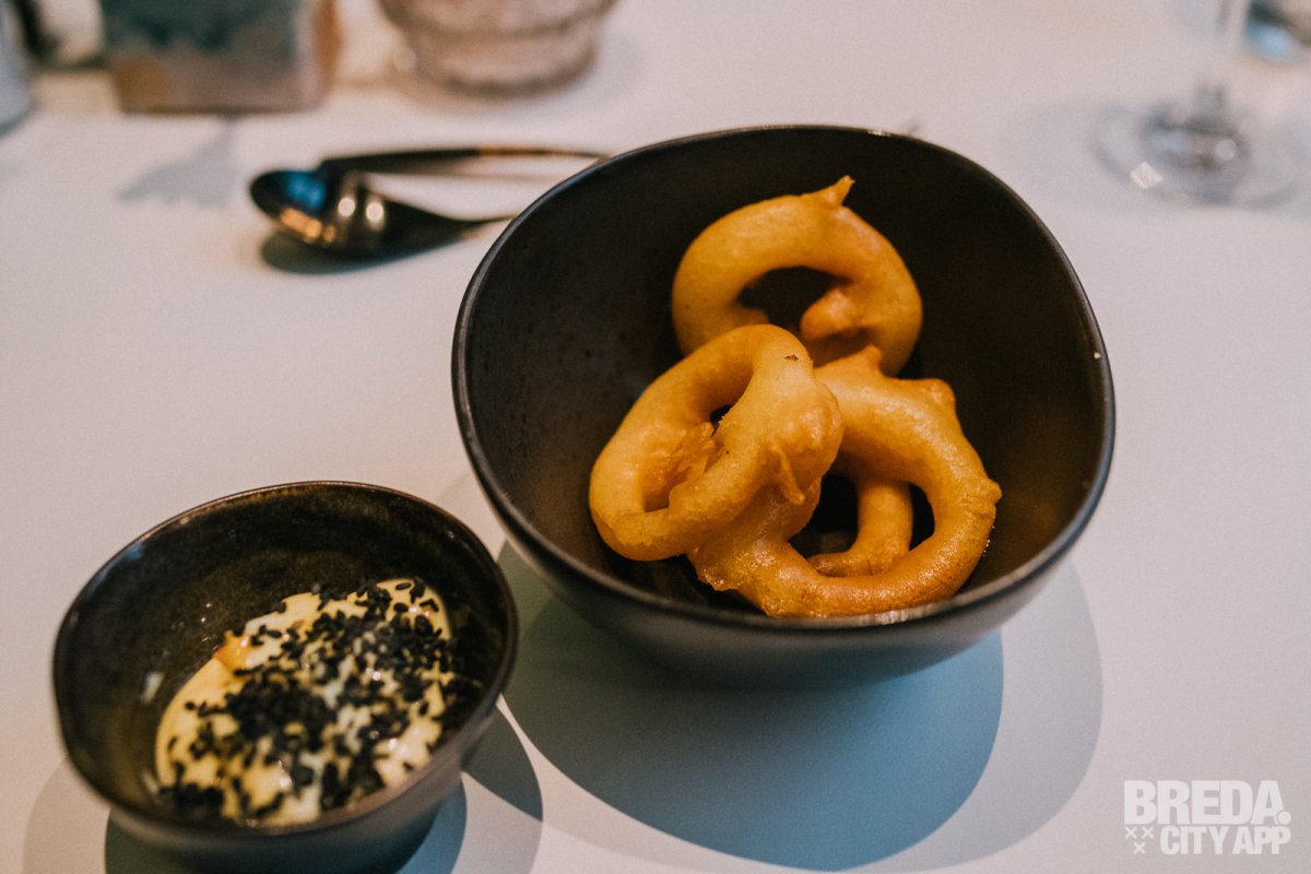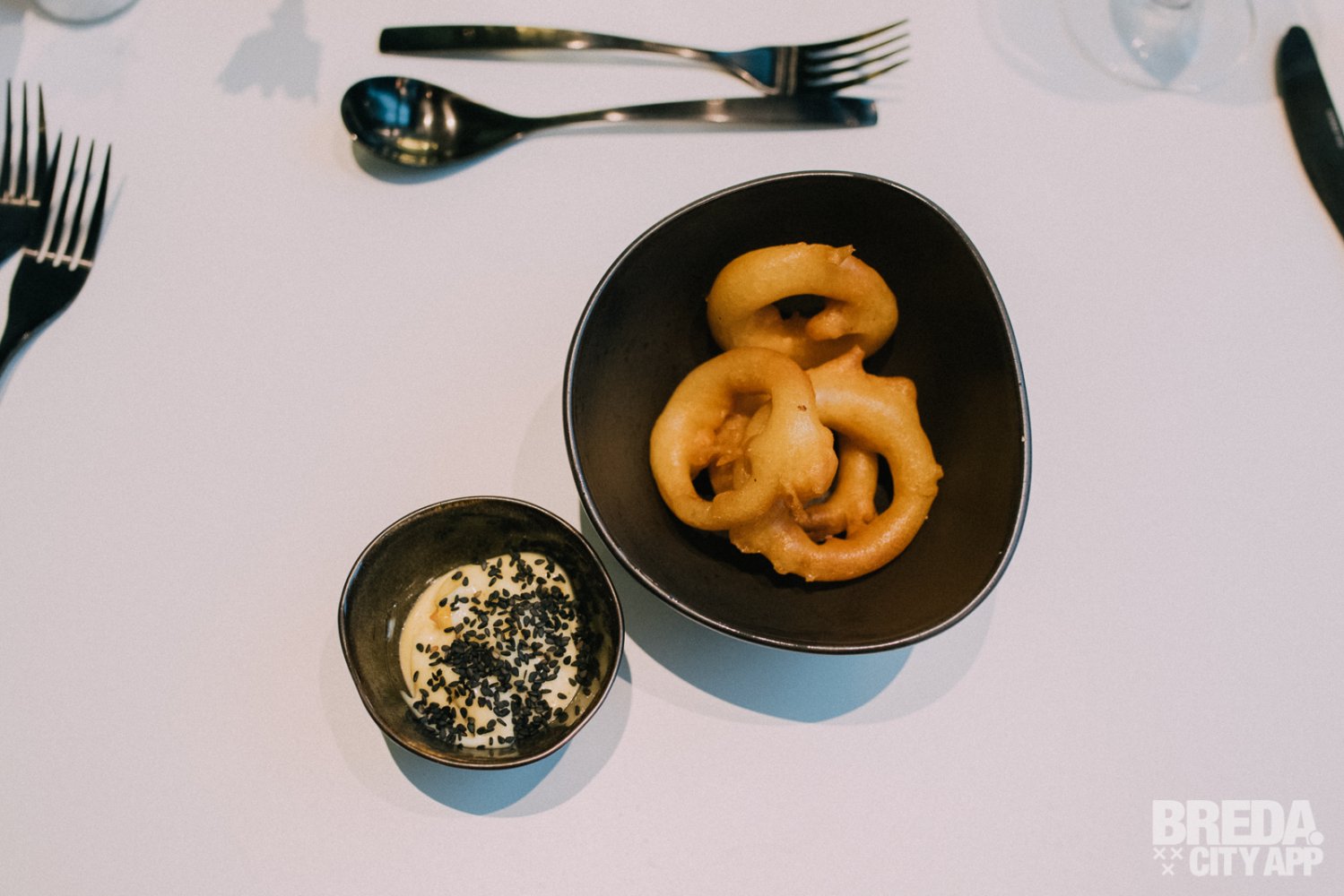 Bij CiCo heeft geen uitgebreide menukaart, maar een wisselend menu. We starten met een amuse van gefrituurde uienringen met miso mayonaise. Miso is een gefermenteerde pasta van sojabonen. In het Japans noemt men miso de vijfde smaak, ofwel umami. Dit komt doordat miso niet zoet, zuur, zout of bitter is, maar een eigen nieuwe smaak heeft. Hierbij drinken we een heerlijke prosecco van Moscato.