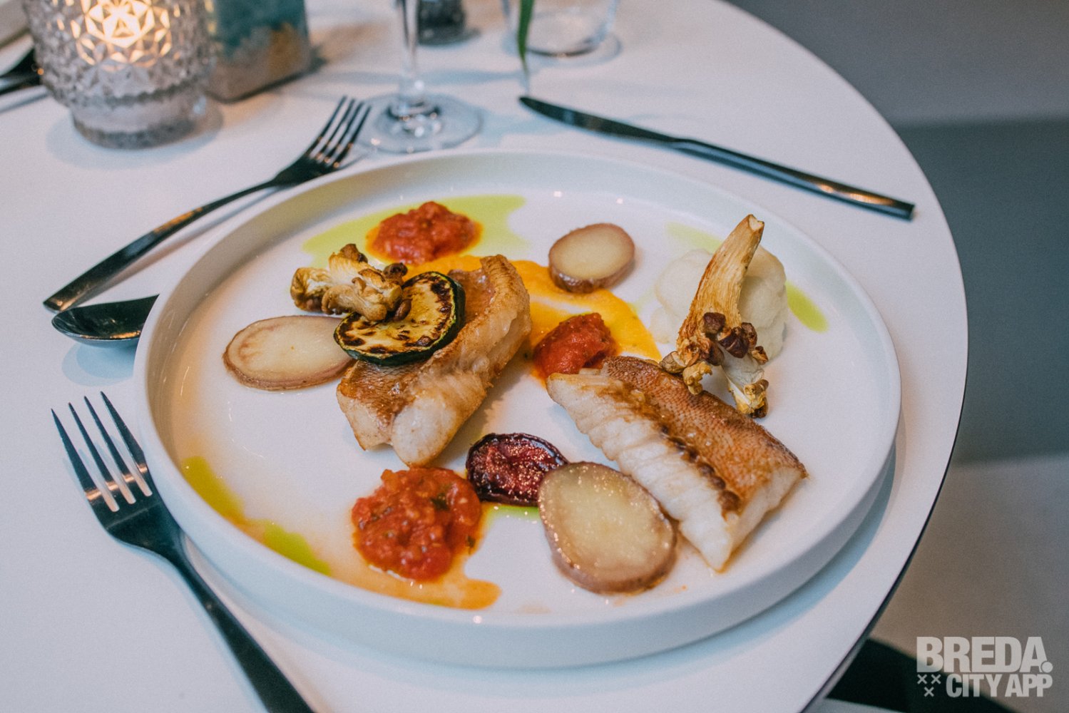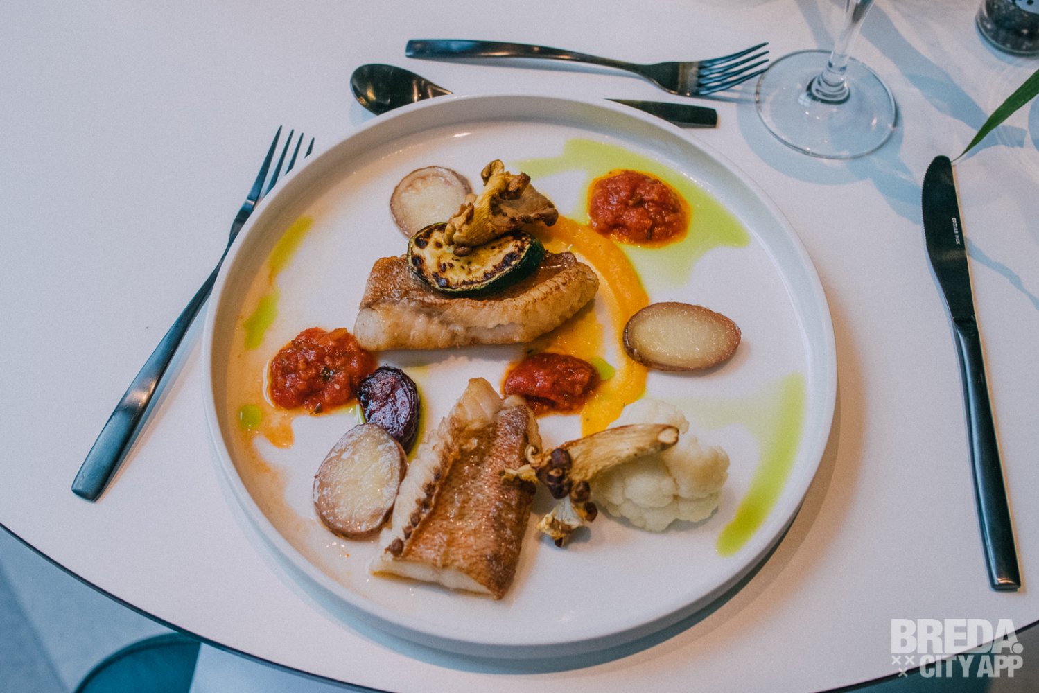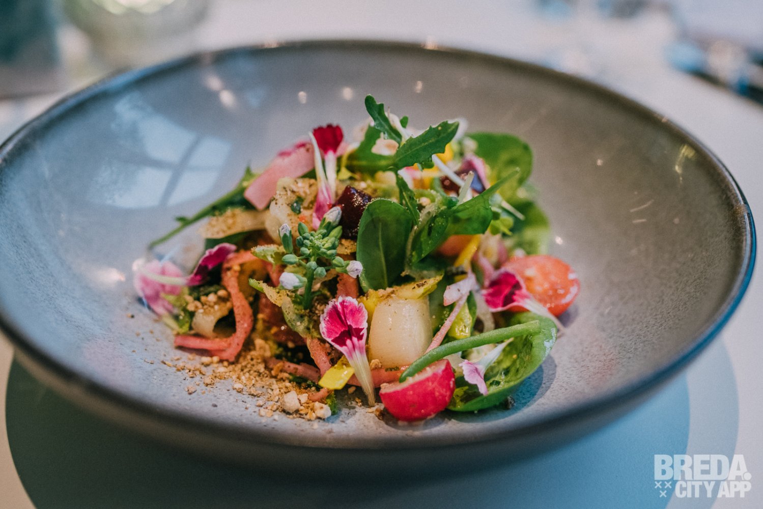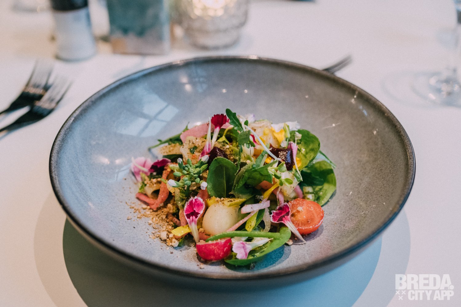 Het voorgerecht is een groentetuintje met een crème van knolselderij, bloemen, ingelegde prei, gegrilde courgette, basilicum mayo en eetbare aarde. Het gerecht is prachtig opgemaakt en mooi op smaak. Het is een verfijnde combinatie van aardse tonen en lichte zuurtinten, afgewisseld met verschillende texturen.