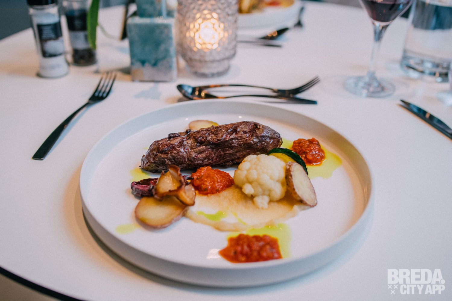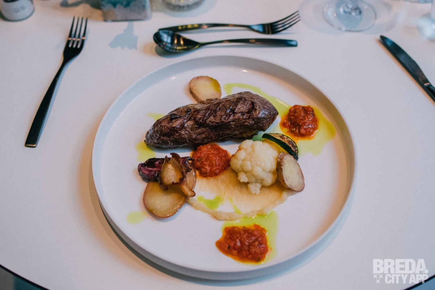 Als hoofdgerecht kiezen we twee verschillende gerechten: de gegrilde runderbavette en gebakken roodbaars. De gebakken roodbaars wordt geserveerd met twee bereidingen van pompoen, gekonfijte Ratte aardappel en bloemkool. Ook dit gerecht is wederom prachtig opgemaakt, waarbij de smaak zeker niet onder doet. De vis is goed gegaard en heeft een stevige structuur. Het gerecht heeft een mooie balans van volle en romige smaken en frisse zuren. We drinken hierbij een Chardonnay van Bonsai uit 2017.