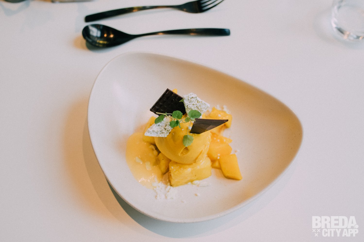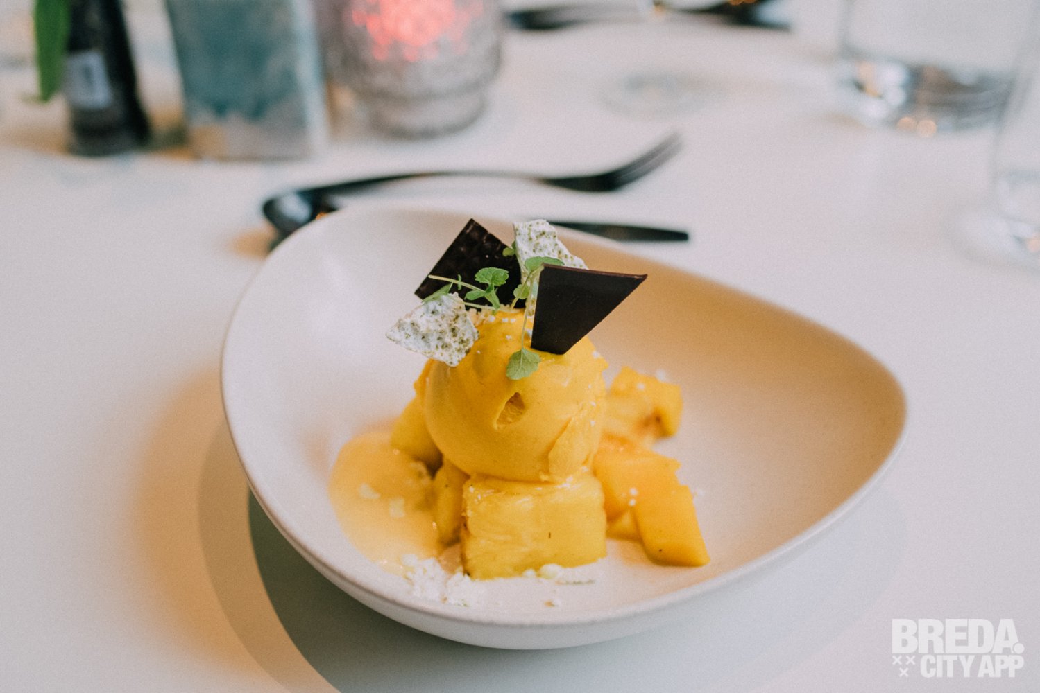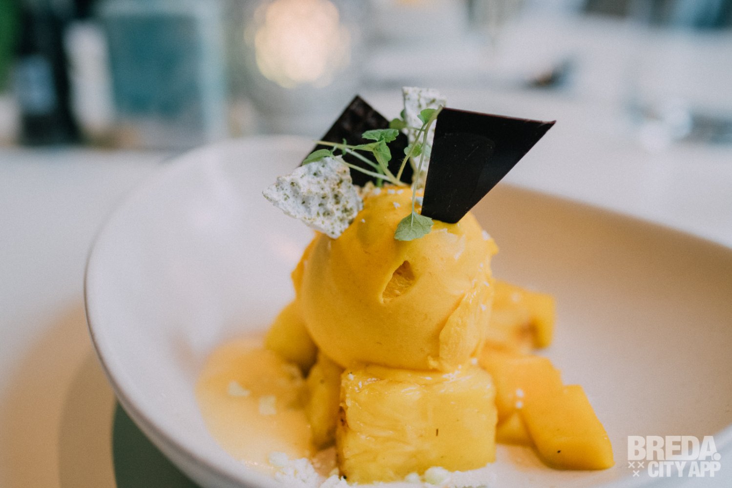 Het nagerecht is gebakken en gemarineerde ananas en mango (koud geserveerd) met mango sorbetijs, kokos sabayon en atsina cress. Het ijs is zelfgemaakt en buitengewoon romig en zacht van smaak, een ware smaakexplosie. De pure chocolade geeft een lekker bittertje aan het gerecht en de atsina cress zorgt voor een mooi krokantje.