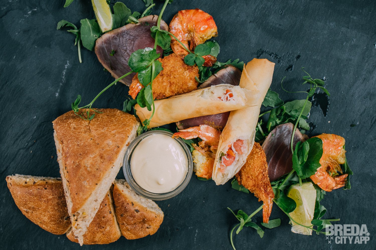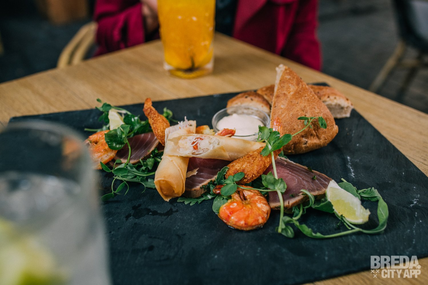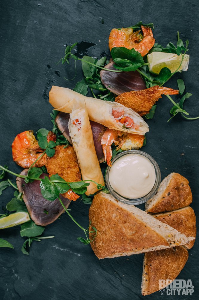 Het weer is goed, dus besluiten we om lekker buiten op het terras plaats te nemen. Bedrijfsleidster Karlijn ontvangt ons vrolijk met twee cocktails: Henry's Paloma en Mystic & Spice. We besluiten om ons te laten verrassen en laten Karlijn een aantal gerechten van de kaart kiezen. We starten met de borrelplank vis, bestaande uit gemarineerde tonijn, butterfly shrimps, garnalenloempia, gamba's, brood en aioli. Een heerlijke zomerse plank, waar we onze vingers bij aflikken!