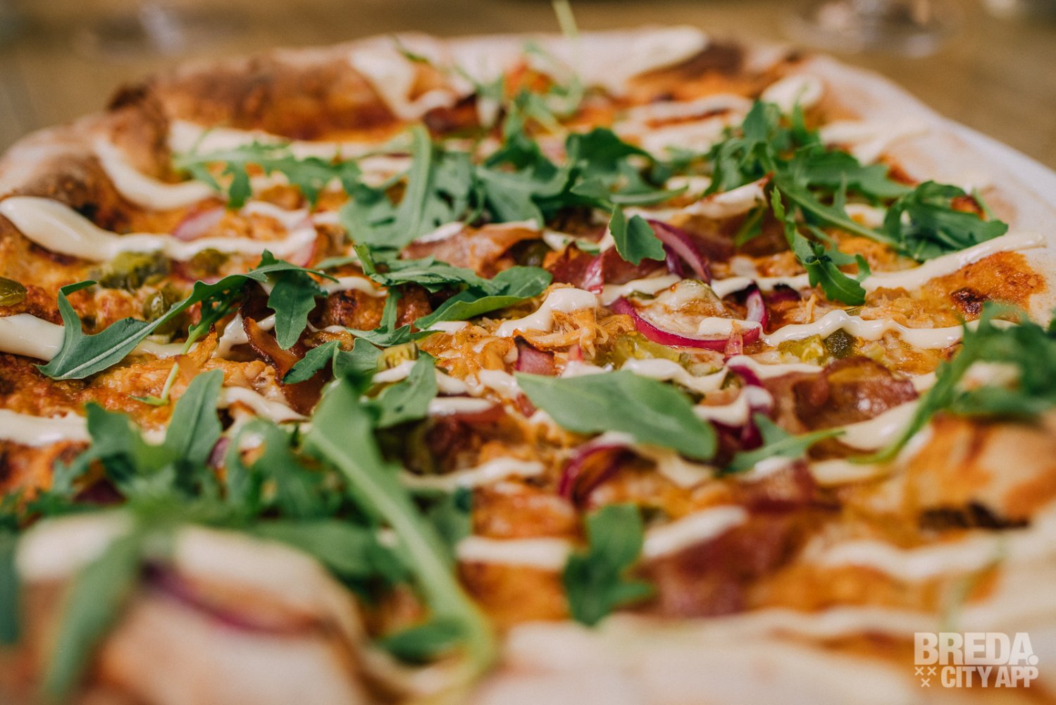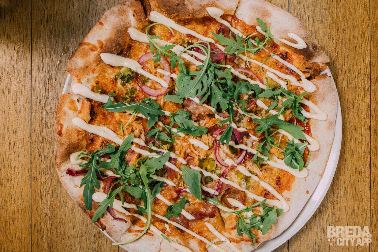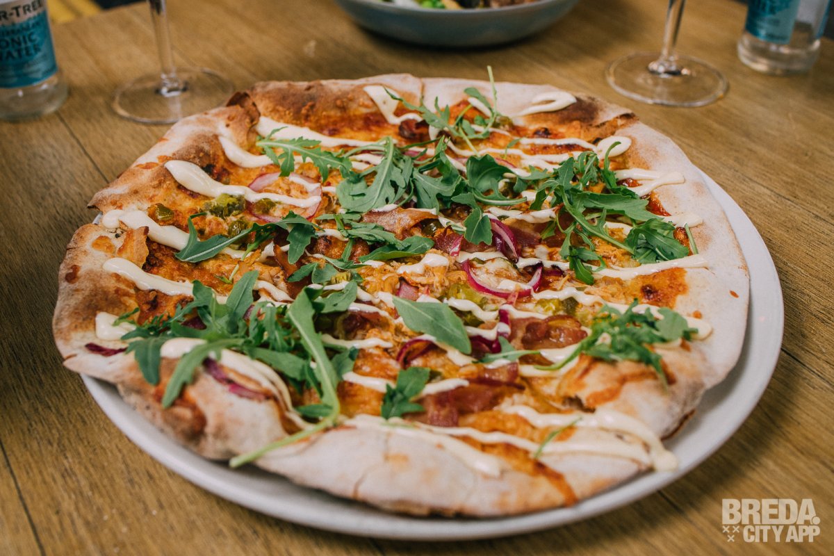 We krijgen tevens de hangover meat special pizza, met pulled checken, oregano, barbecuesaus, ui, spek, jalapeño, knoflooksaus en rucola. Wellicht geen traditionele Italiaanse pizza, maar wel een guilty pleasure! De bodem is flinterdun en mooi krokant, bellissimo!