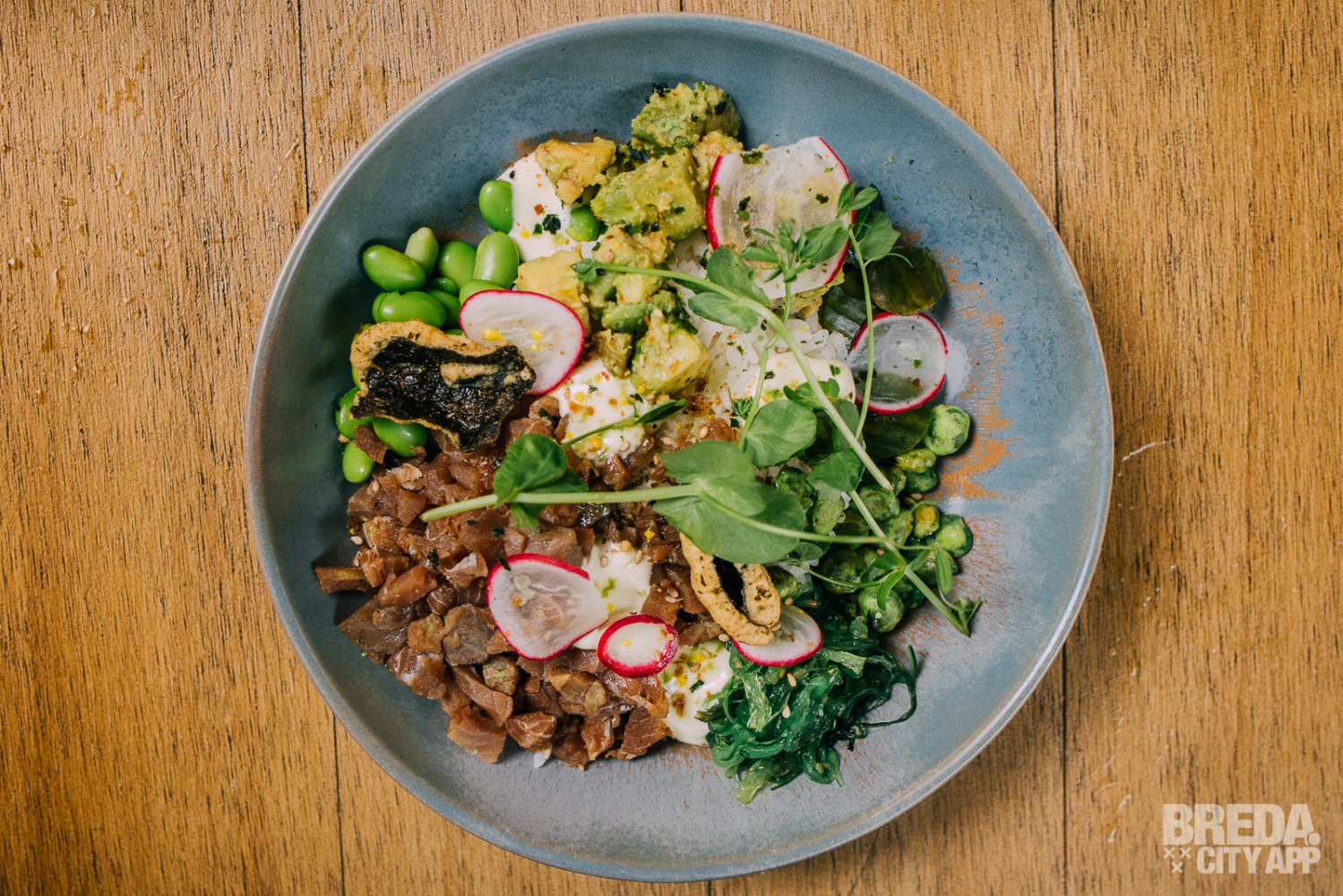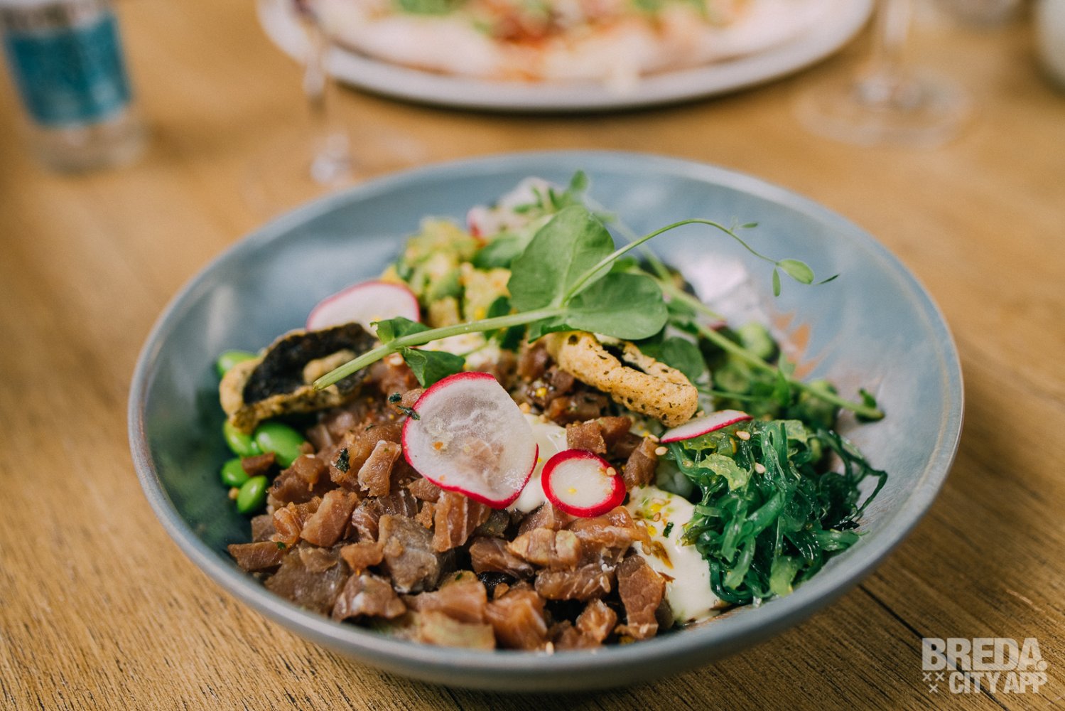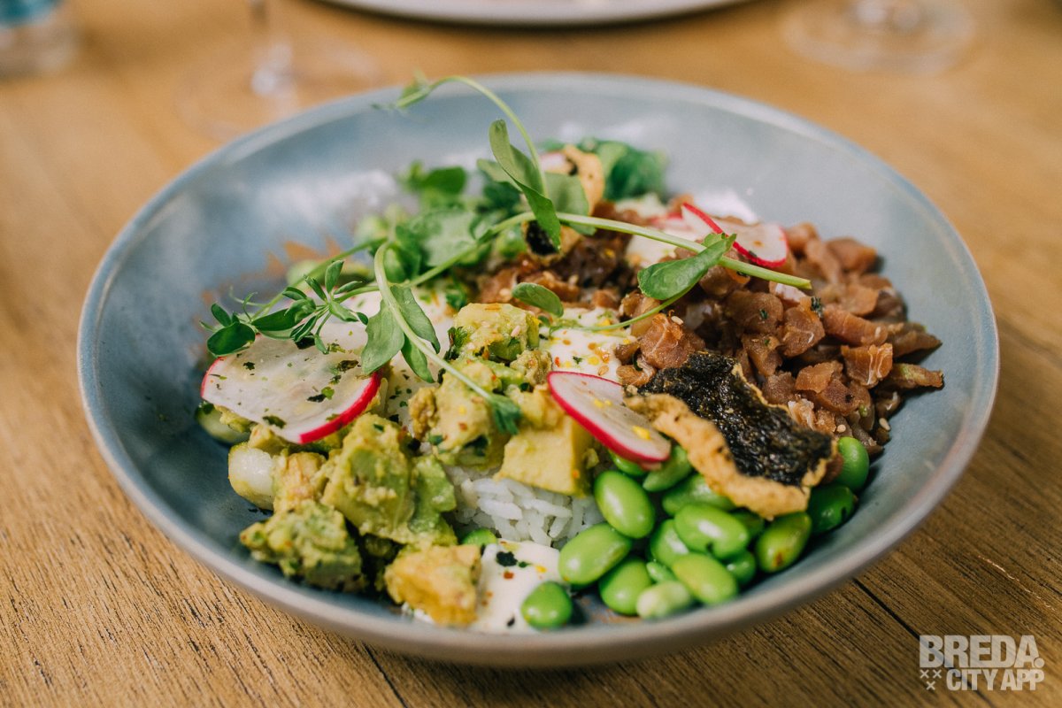 Als hoofdgerecht krijgen we de pokébowl met tonijn en de hangover meat special pizza. De pokébowl wordt geserveerd met gemarineerde tonijn, zoetzure komkommer, edamame, waakse, radijs, avocado, wasabinootjes, furikake, zeewier crunch, wasabidressing en -mayonaise. Het gerecht heeft veel verschillende smaken en texturen, welke mooi in balans zijn. Een licht gerecht, wat heerlijk is op een zomerse dag zoals deze.