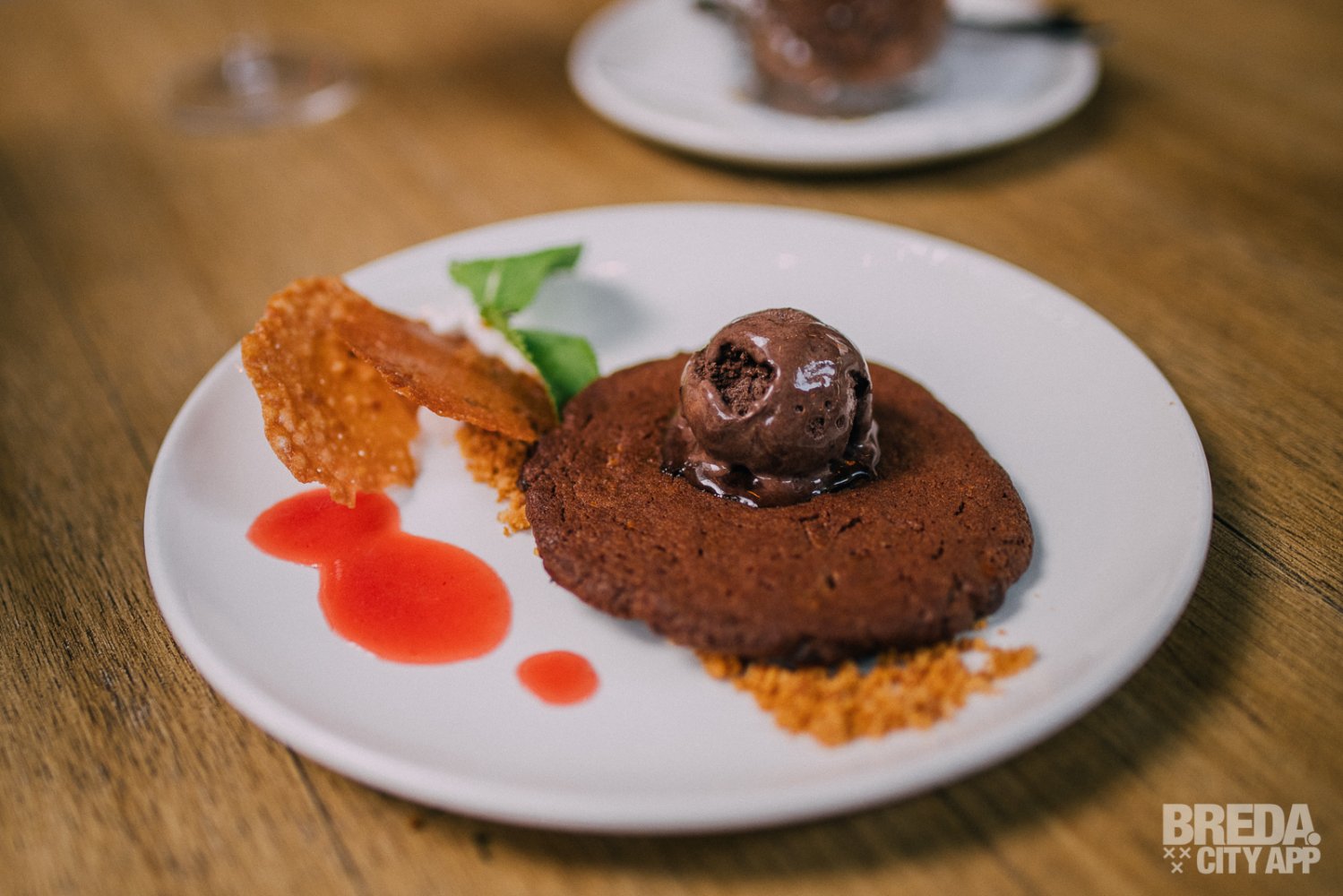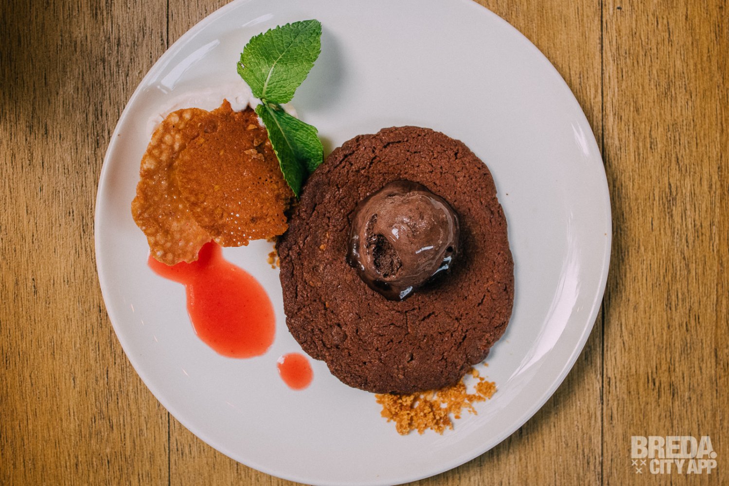 We starten met de "triple choco cookie", met aardbeischuim en kletskoppen. De krokante koek wordt geserveerd met een bolletje chocolade ijs erop. Het aardbeischuim zorgt voor een lekker frisse toevoeging aan het gerecht.