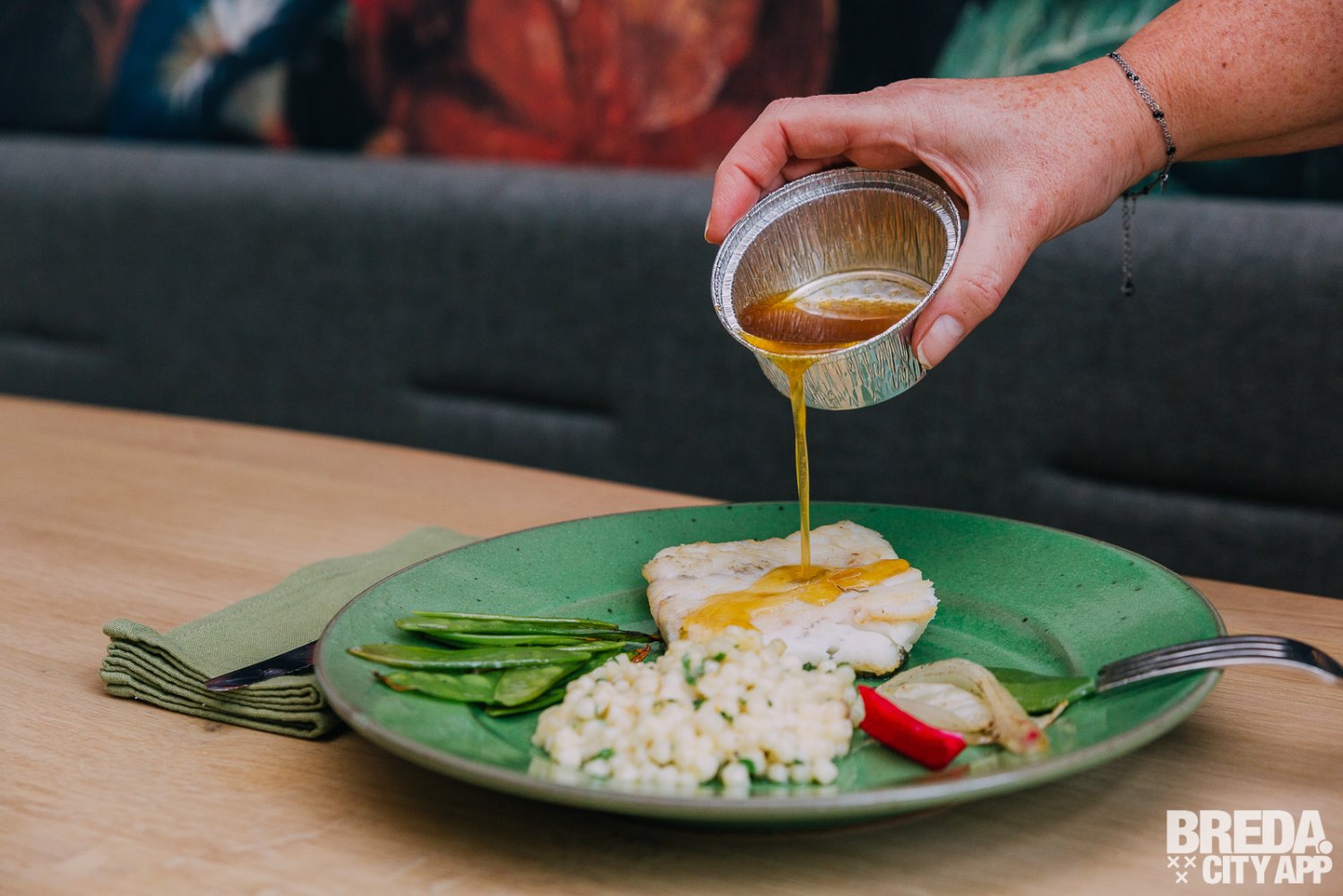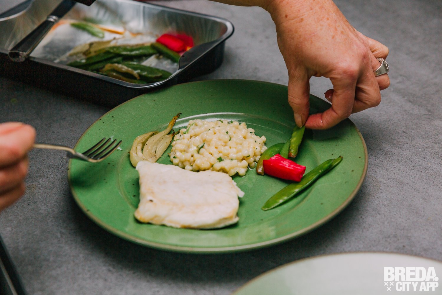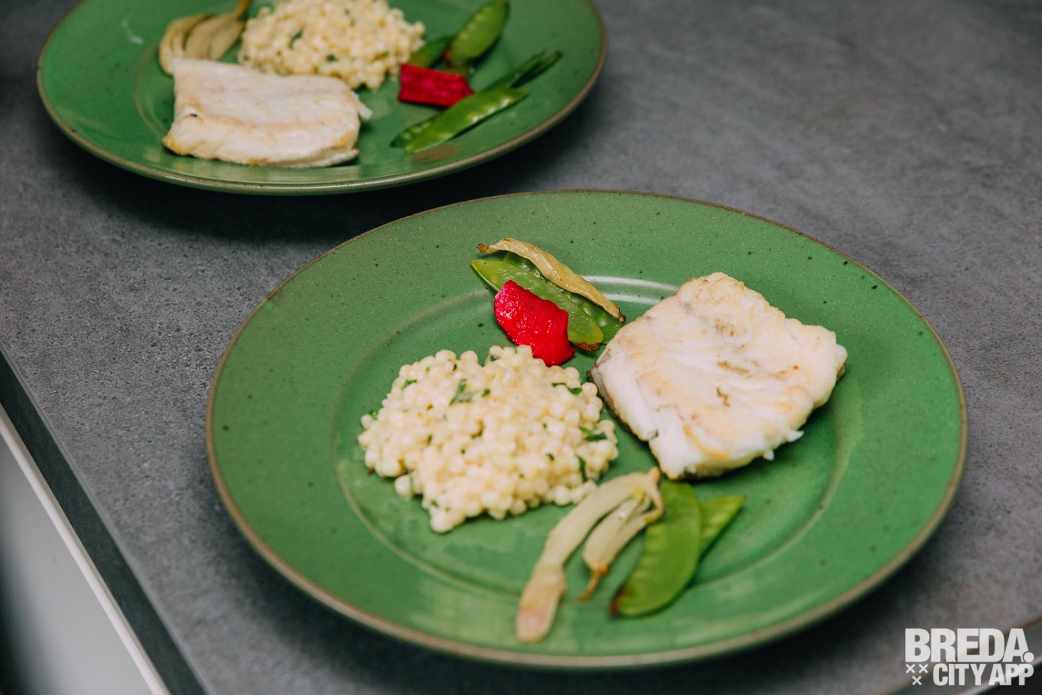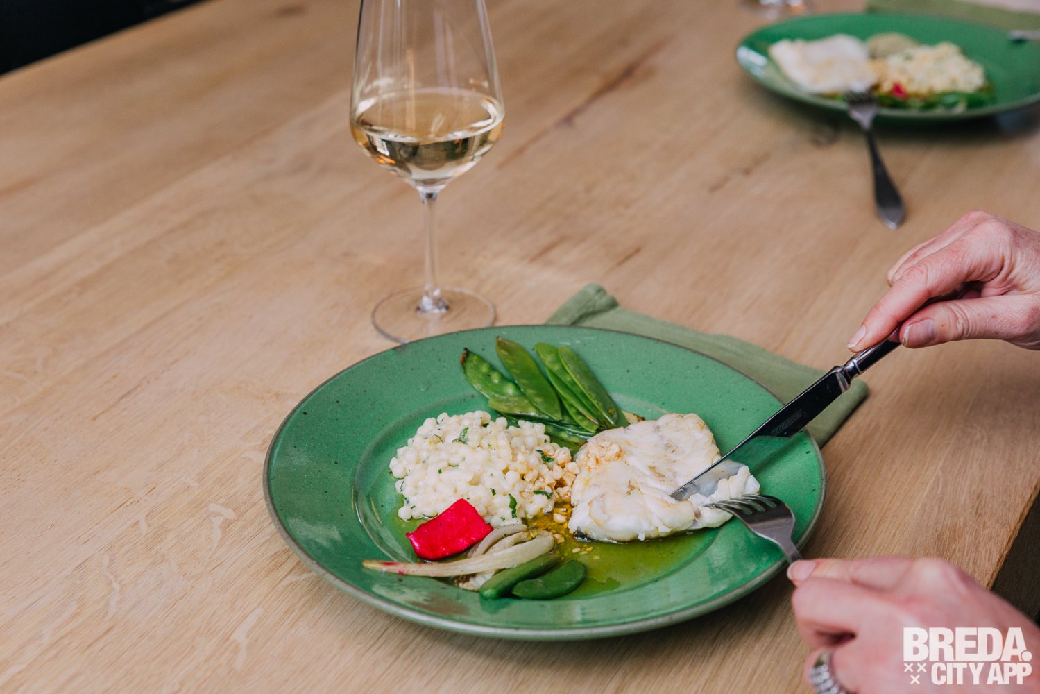 Het hoofdgerecht kan zó in de meegeleverde schaal de oven in. Geen gedoe met pannen, geen afwas. De laatste 5 minuten gaan onze borden mee de oven in en schenken we de volgende wijn in. Dan gieten we de warme Beurre Noisette over de vis en garneren ons bord met knapperige groenten en de Fregola Fenegriek. Op de website hebben we al kunnen lezen wat skrei precies is; een jonge winterkabeljauw die leeft in de Barentszzee en wordt gezien als een delicatesse. Even later begrijpen we waarom.
