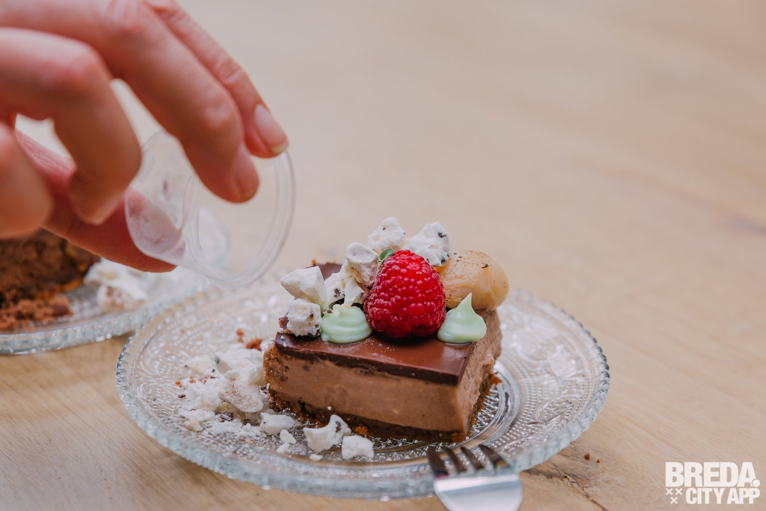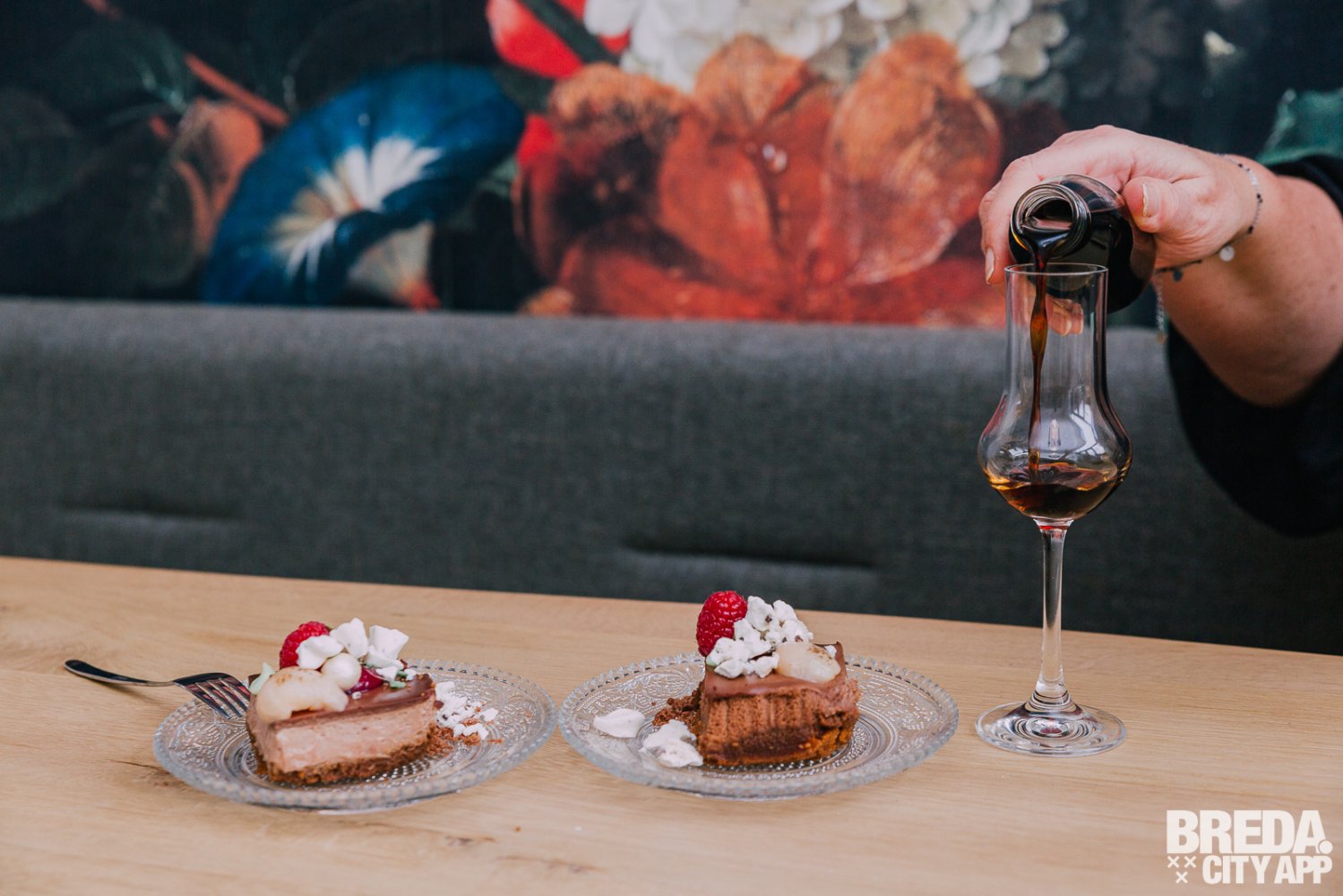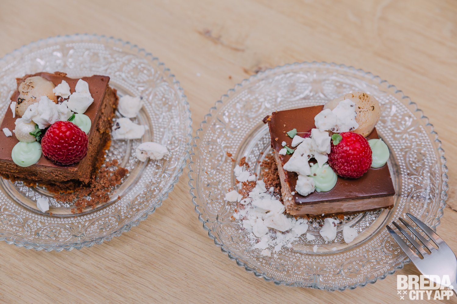 Na een korte break zijn we klaar voor het nagerecht: een uitermate fotogenieke chocolade cheesecake met een bodem van speculaas en krokante merengue. Dit dessert heeft alles; de zoete smaak van romige chocolade en subtiele hinten van fruit, munt en kaneel. De stroperige kruidige Pedro Ximénez met zijn aroma’s van gedroogde vijgen en noten vormt met de chocolade een combinatie om van te watertanden.