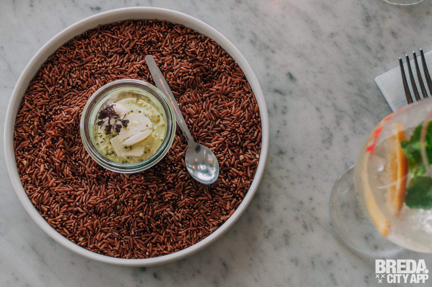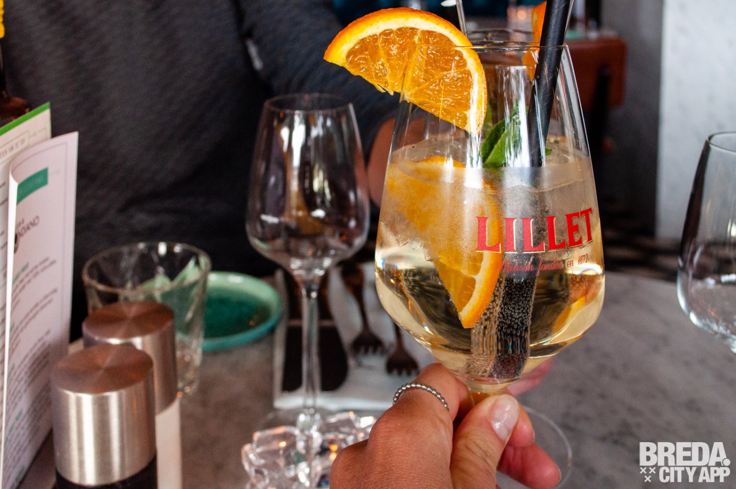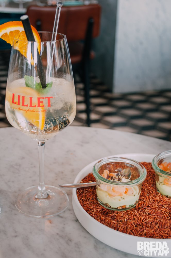 Direct bij ontvangst wordt ons een aperitief aangeboden. We beginnen de avond meteen goed met een heerlijke Lillet, een combinatie van witte wijn versterkt met tonic. Deze combinatie gaat bijzonder goed samen en de munt en sinaasappel maken dit verfrissende drankje af. Bij het aperitief wordt een amuse van avocado crème met garnalen op een laagje van een crunch van wasabi noten geserveerd. Voor de vegetarische optie van de amuse zijn de garnalen vervangen door Parmezaanse kaas, wat verrassend lekker is. Deze licht zoute kaas is namelijk een subtiele tegenhanger van de zachte avocado crème en haalt alle zachte smaken van de amuse nog net iets meer naar boven.