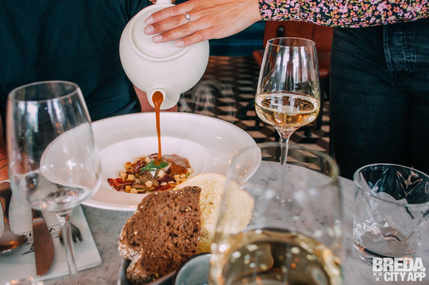 Terwijl wij genieten van het eerste gerecht, komt de avond langzaam op gang en stroomt het restaurant verder vol. Gasten worden vriendelijk ontvangen en ook het team van personeel breidt zich uit. Iedereen binnen het personeel helpt ons even vriendelijk en gastvrij. Inmiddels volgt het tussengerecht: de Zuppa di Verdure, een Italiaanse geroosterde groentesoep. Het gerecht wordt geserveerd met krokante Coppa di Parma (een Italiaanse ham), gerookte paddenstoelen, lavas & lavas olie en knoflookcroutons. In het vegetarische gerecht is de Coppa di Parma vervangen door extra gerookte paddenstoelen. De Italiaanse geroosterde groentesoep is goed gevuld en wordt pas aan tafel ingeschonken. Doordat de soep pas aan tafel wordt geserveerd (uit een te leuke theepot), is de temperatuur van de soep perfect. Lekker! Bij de soep wordt een Chardonnay van LaGarde uit Argentinië geschonken, een frisse, elegante wijn met een mineralige, lange afdronk en absoluut mijn favoriet van de avond.