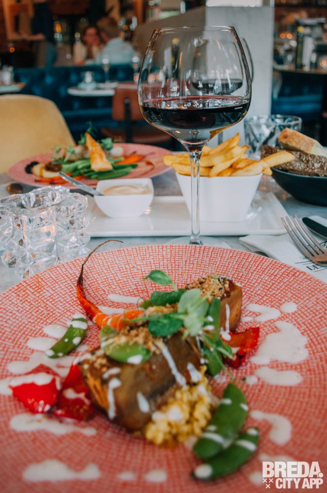 De vegetarische variant van het hoofdgerecht is een gerookte aubergine met een kruidenlak, dukkah kruiden & noten en afgemaakt met een frisse limoen yoghurt. De combinatie van de kruiden en de lak geeft een lekker subtiele, kruidige maar zachte bite aan de aubergine. Ook bij dit gerecht wordt een rode wijn geserveerd. Deze rode wijn is een Tempranillo van Mas Rabell uit Spanje met een kruidige, nootachtige smaak die goed aansluit op de subtiele kruidige bite van de aubergine.