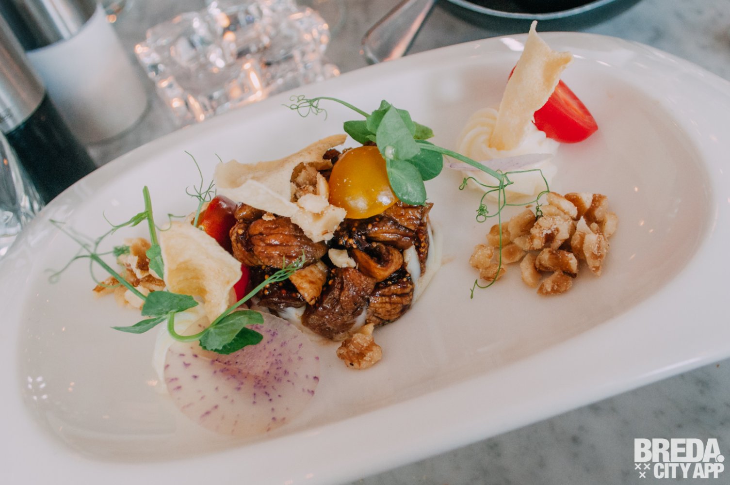De vegetarische optie voor de steak tartaar is ook een ‘tartaar’ maar dan gemaakt van vijgen. Door de combinatie van gehakte vijgen met walnoten, hazelnoten, manchego crème en mascarpone zijn de smaken in balans en niet te zoet. Ook bij dit gerecht wordt bijpassende wijn geschonken, een zachte Sauvignon Blanc van Santa Digna uit Chili.
